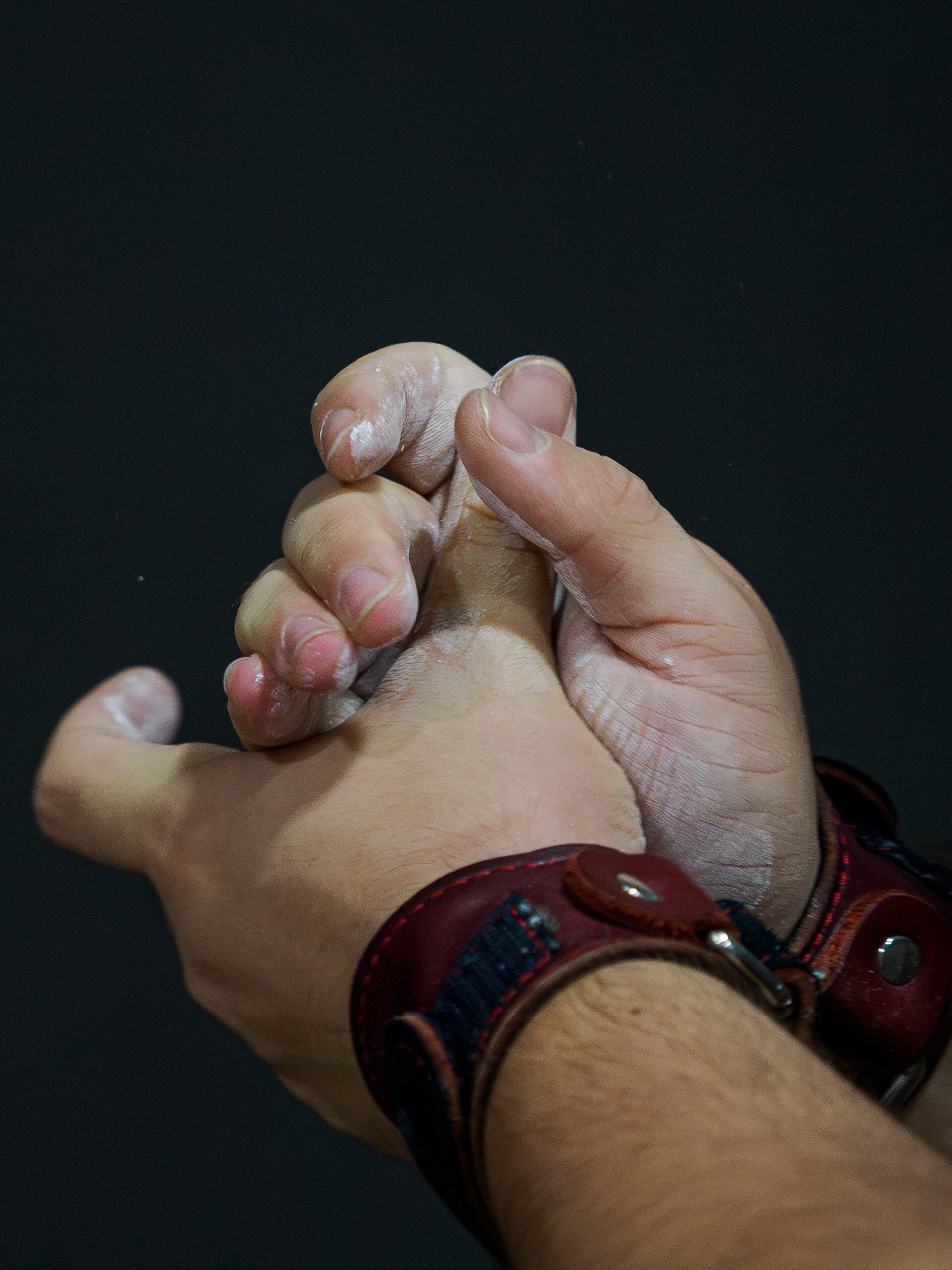 Tito Heredia rubs a chalk-like substance into his hands for better grip during a weightlifting session at Tipton Lakes Athletic Club in Columbus, Ind., Friday, July 11, 2025.