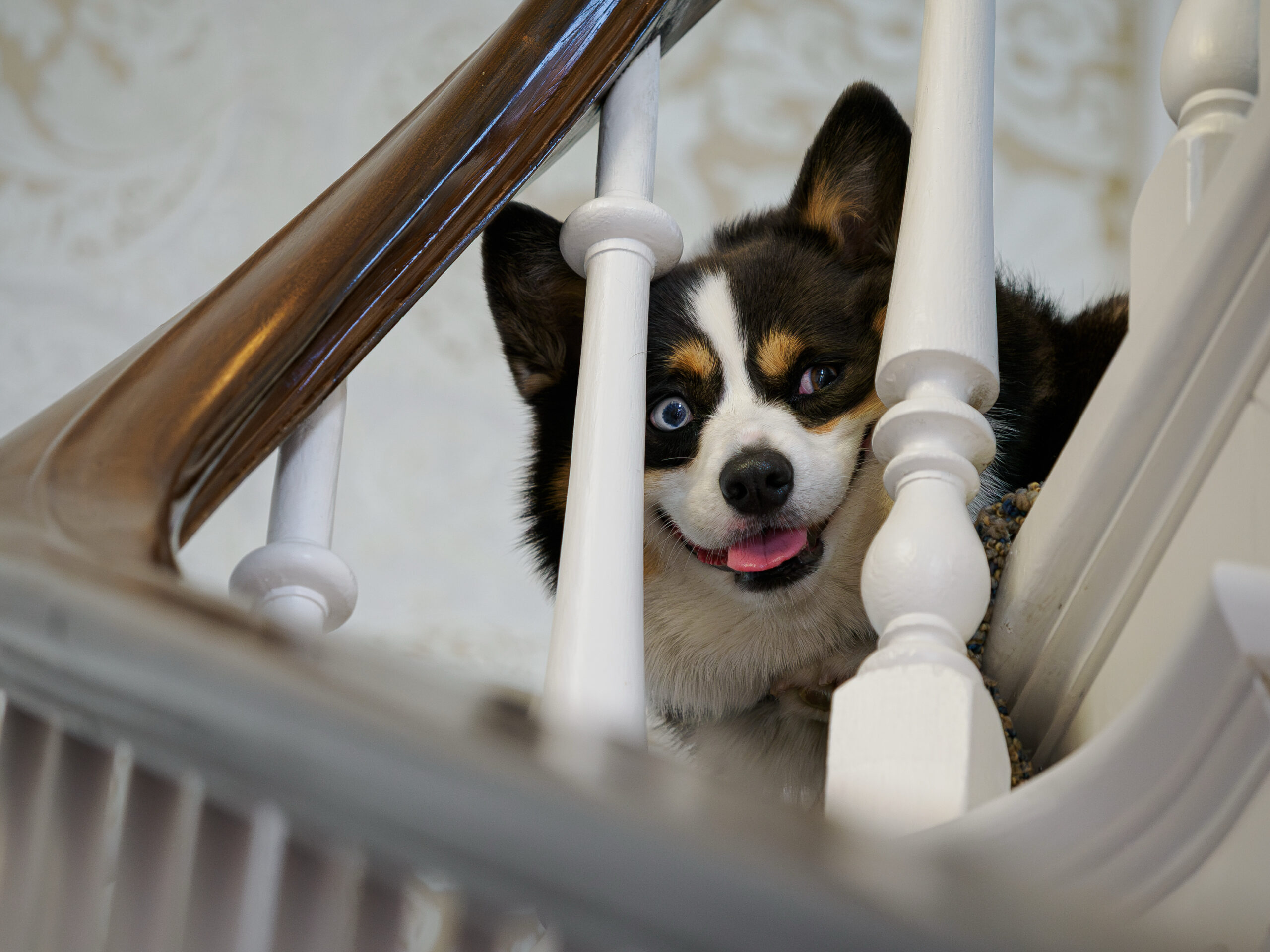 Amy Laker’s Corgi named Moon peers through the posts that support the banister at the Heritage Fund building in downtown Columbus, Ind., Thursday, July 24, 2025. Moon is Heritage Fund’s “office co-org-i-nator.