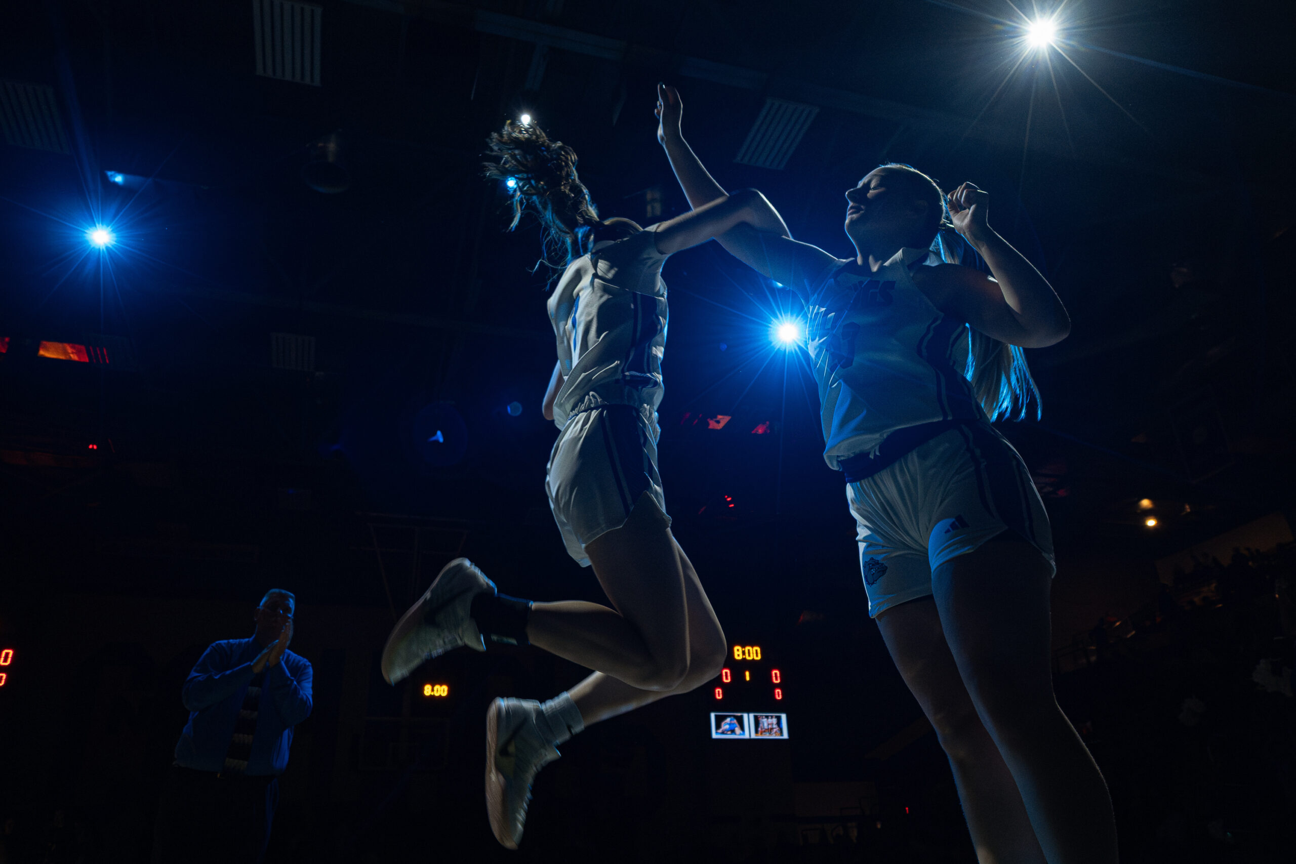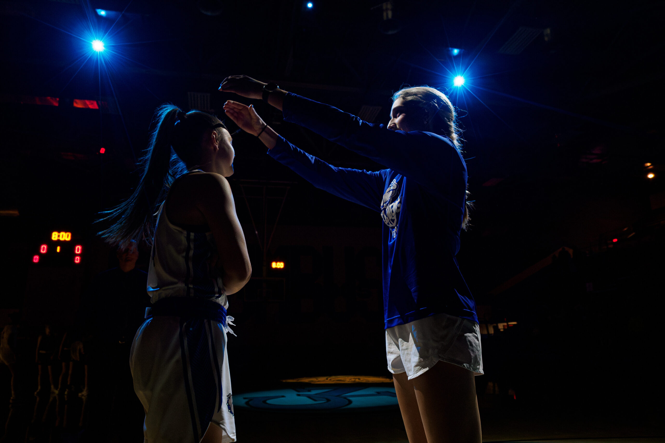 Columbus North’s Miley McClellan, right, gestures like she’s putting a crown on teammate Hadassah Hurt’s head during player introductions for a basketball game between Columbus North and Silver Creek at Columbus North High School in Columbus, Ind., Wednesday, January. 22, 2025.