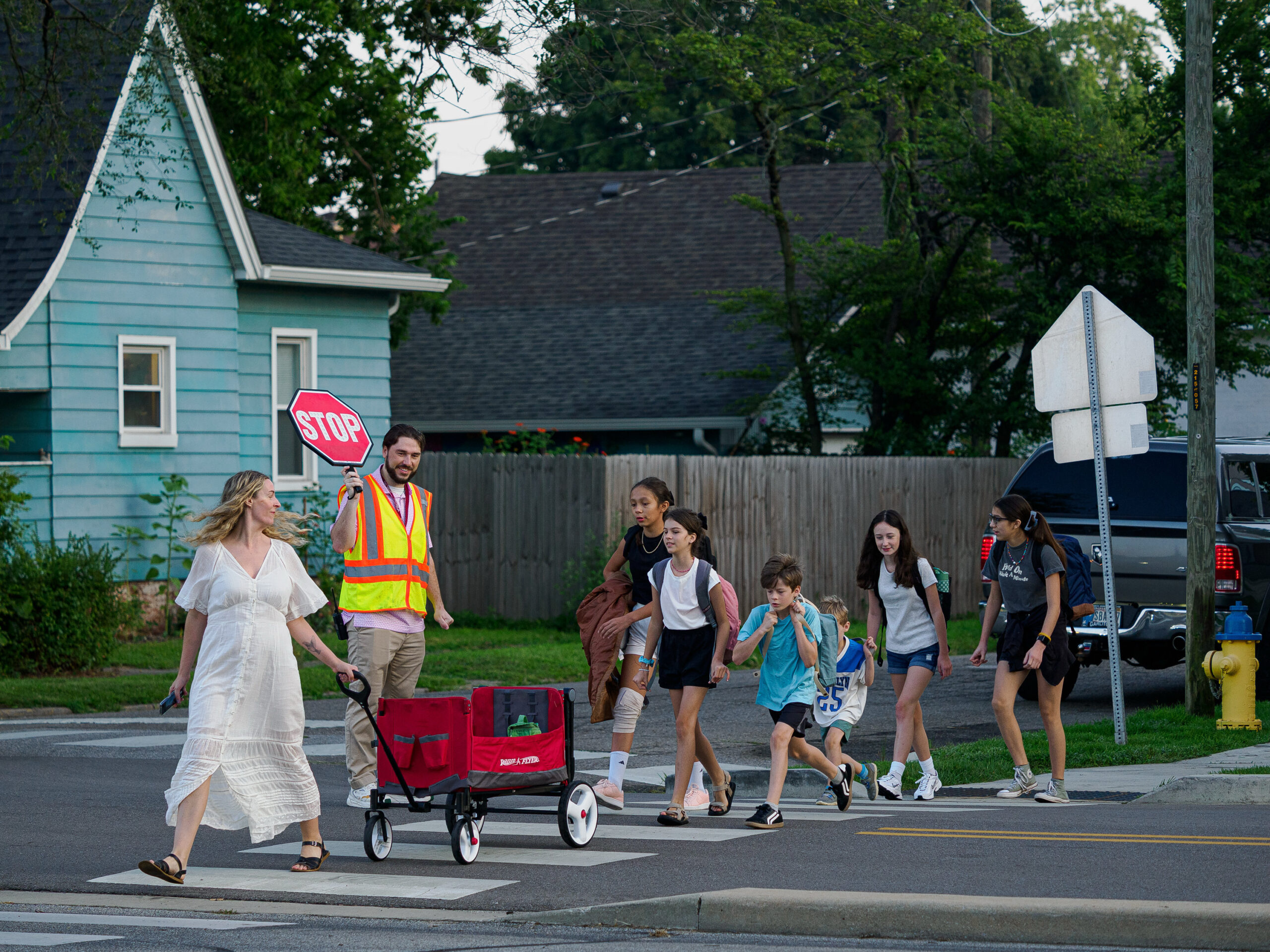 Rachel Hunt leads a group of school goers across 7th Street on the first day of school for the Bartholomew Consolidated School Corporation in Columbus, Ind., Wednesday, Aug. 6, 2025.
