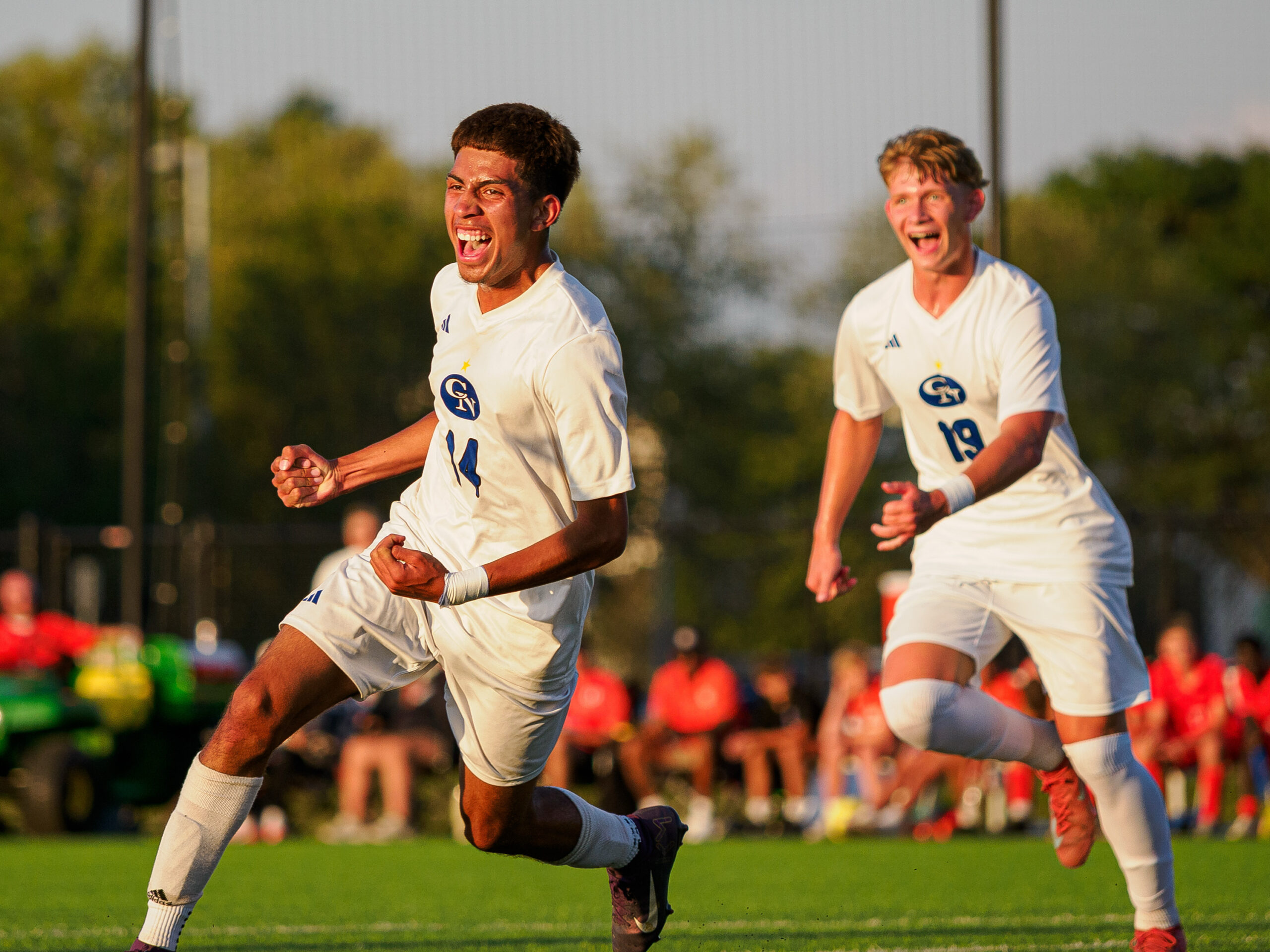 Columbus North’s Manuel Valle celebrates after scoring Columbus North’s opening goal in a match against cross town rival Columbus East at the BCSC Soccer Complex in Columbus, Ind., Thursday, Aug. 28, 2025. North defeated East by a score of 2-0.