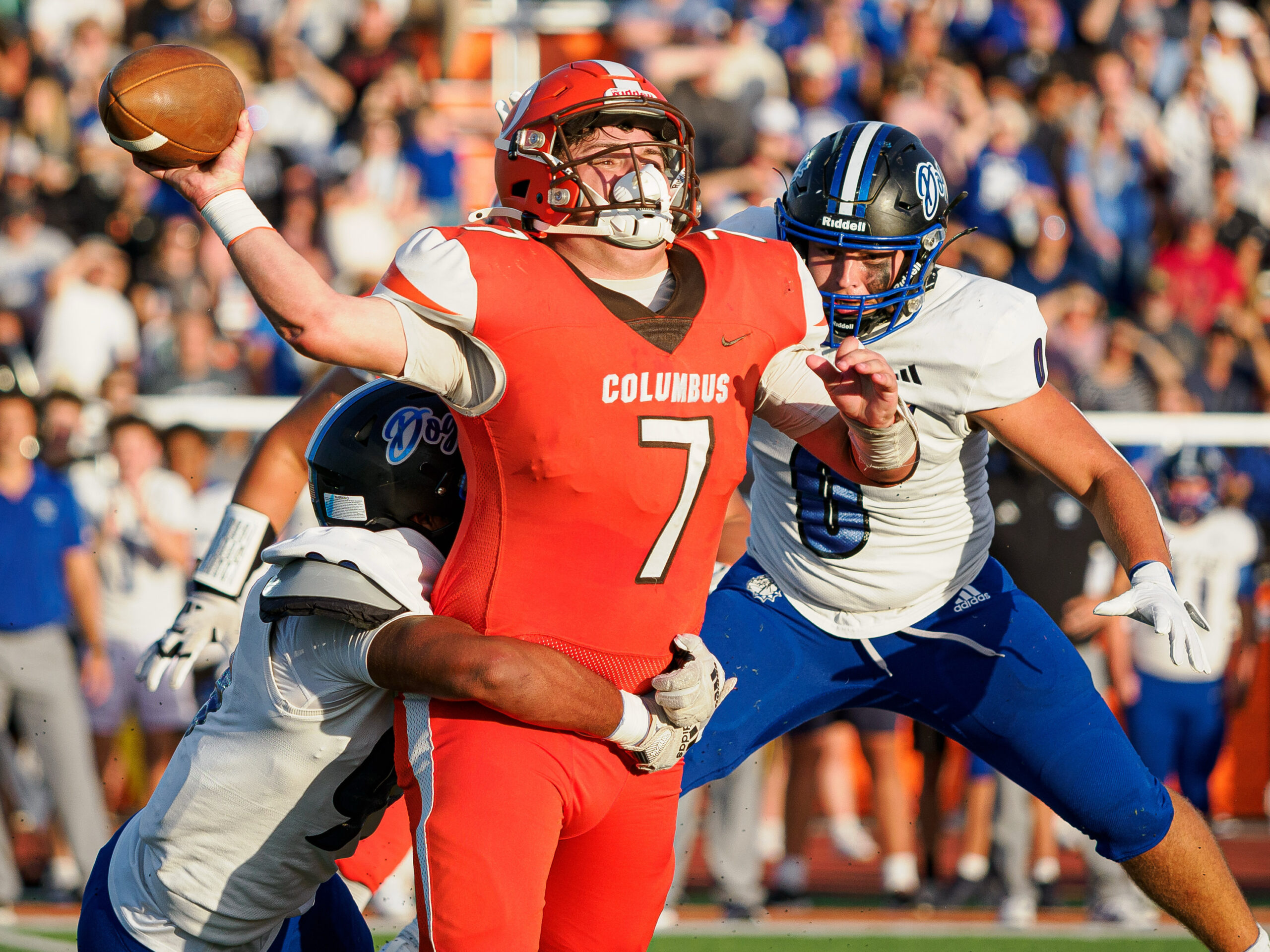 Columbus East quarterback Kyson Villarreal (7) throws the ball to avoid being sacked by Columbus North’s Myles Bruckner, left, and Jaiden Newland during a football game in Bob Gaddis Stadium at Columbus East High School in Columbus, Ind., Friday, Aug. 29, 2025.