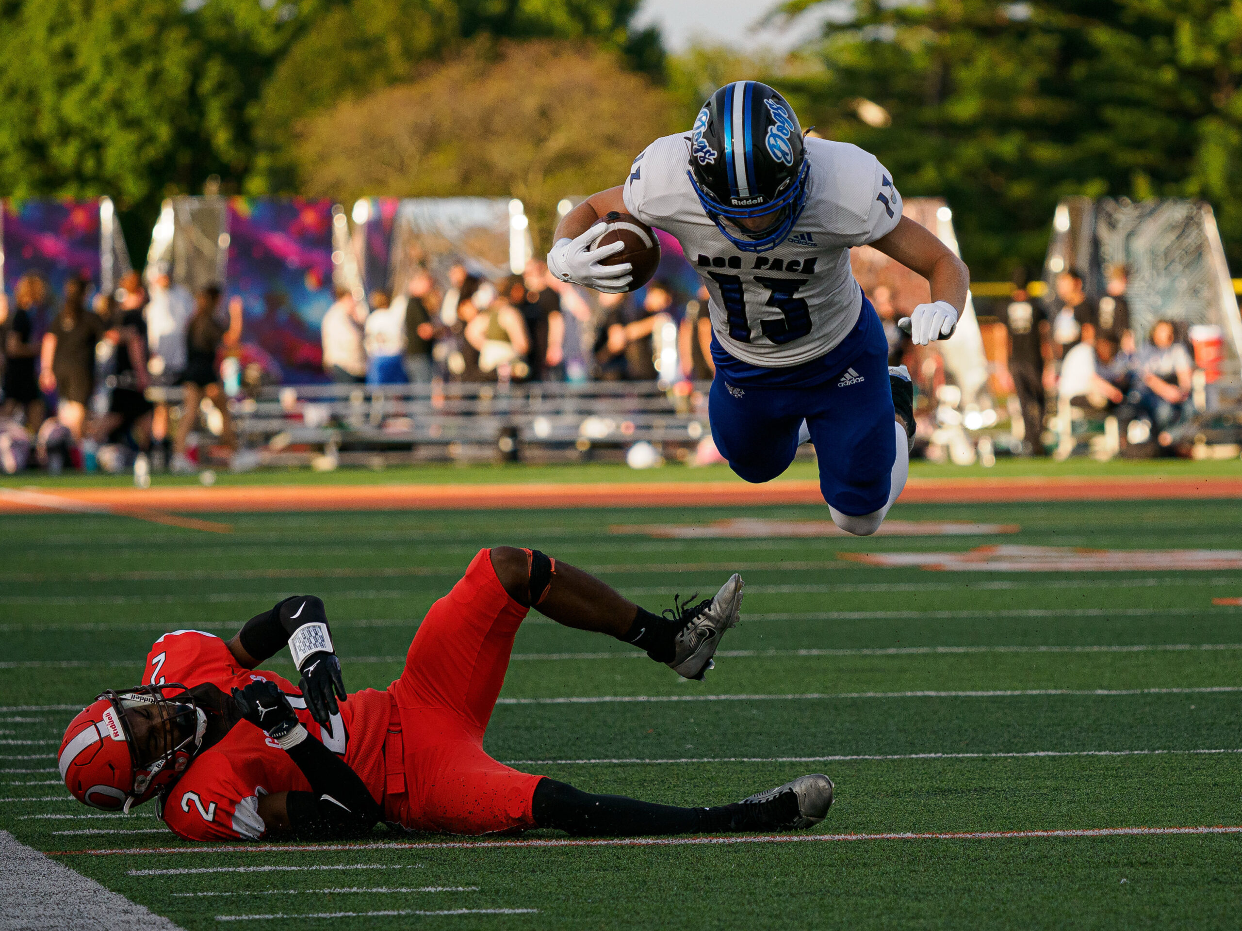 Columbus North’s Morgan Knapp goes airborne after a tackle by Columbus East’s Mykel Jones during a football game in Bob Gaddis Stadium at Columbus East High School in Columbus, Ind., Friday, Aug. 29, 2025.