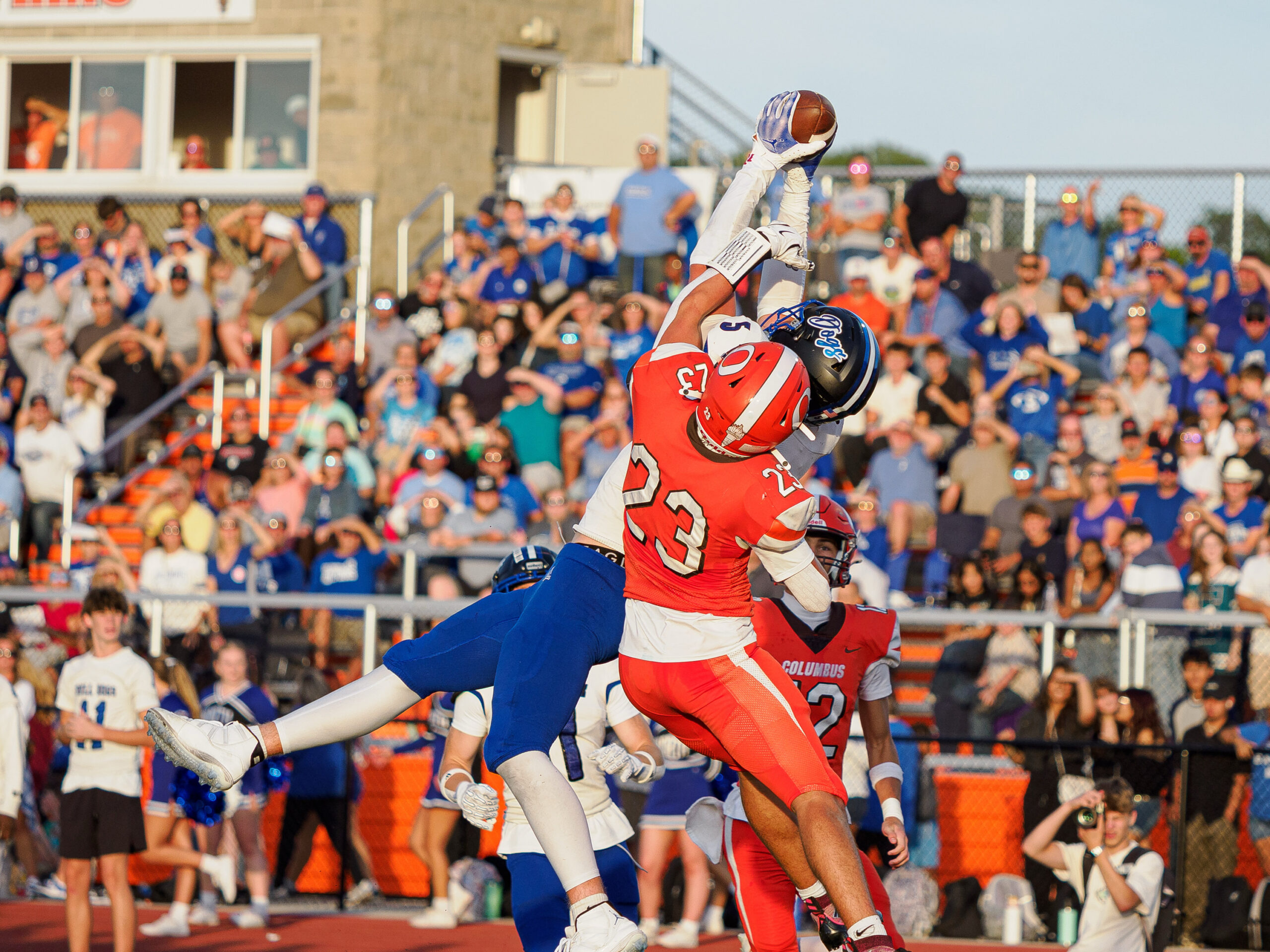 Columbus North’s Parker Elmore, in white, makes a catch while covered by Columbus East’s Dallas Dykstra during a football game in Bob Gaddis Stadium at Columbus East High School in Columbus, Ind., Friday, Aug. 29, 2025.