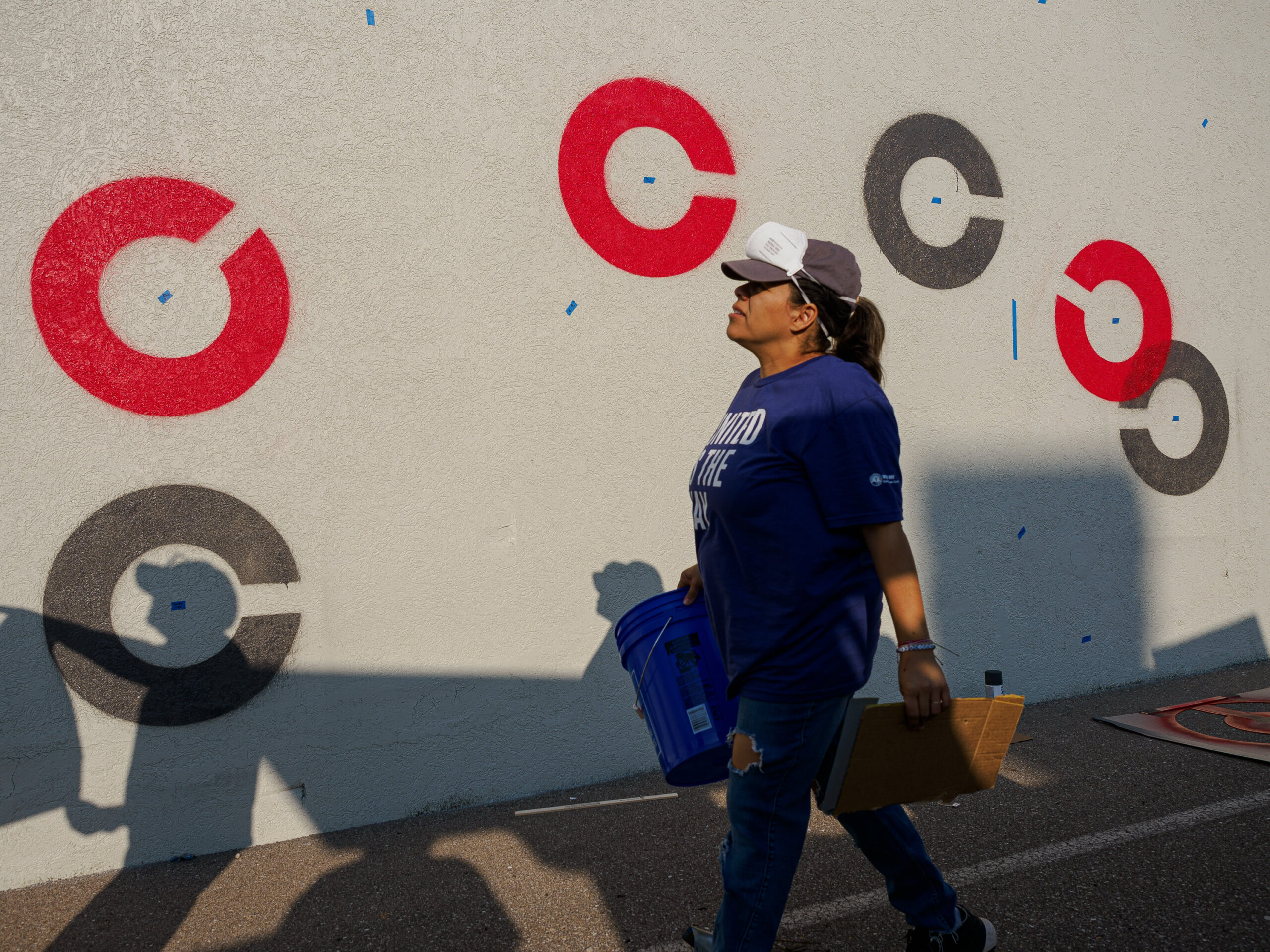 Volunteer Millie Maier carries a bucket and a piece of cardboard as she and other volunteers help paint a mural of Dancing C’s on the side of the LHP building next to the Bartholomew County Historical Society for the United Way’s Day of Service in Columbus, Ind., Thursday, Sept. 11, 2025.