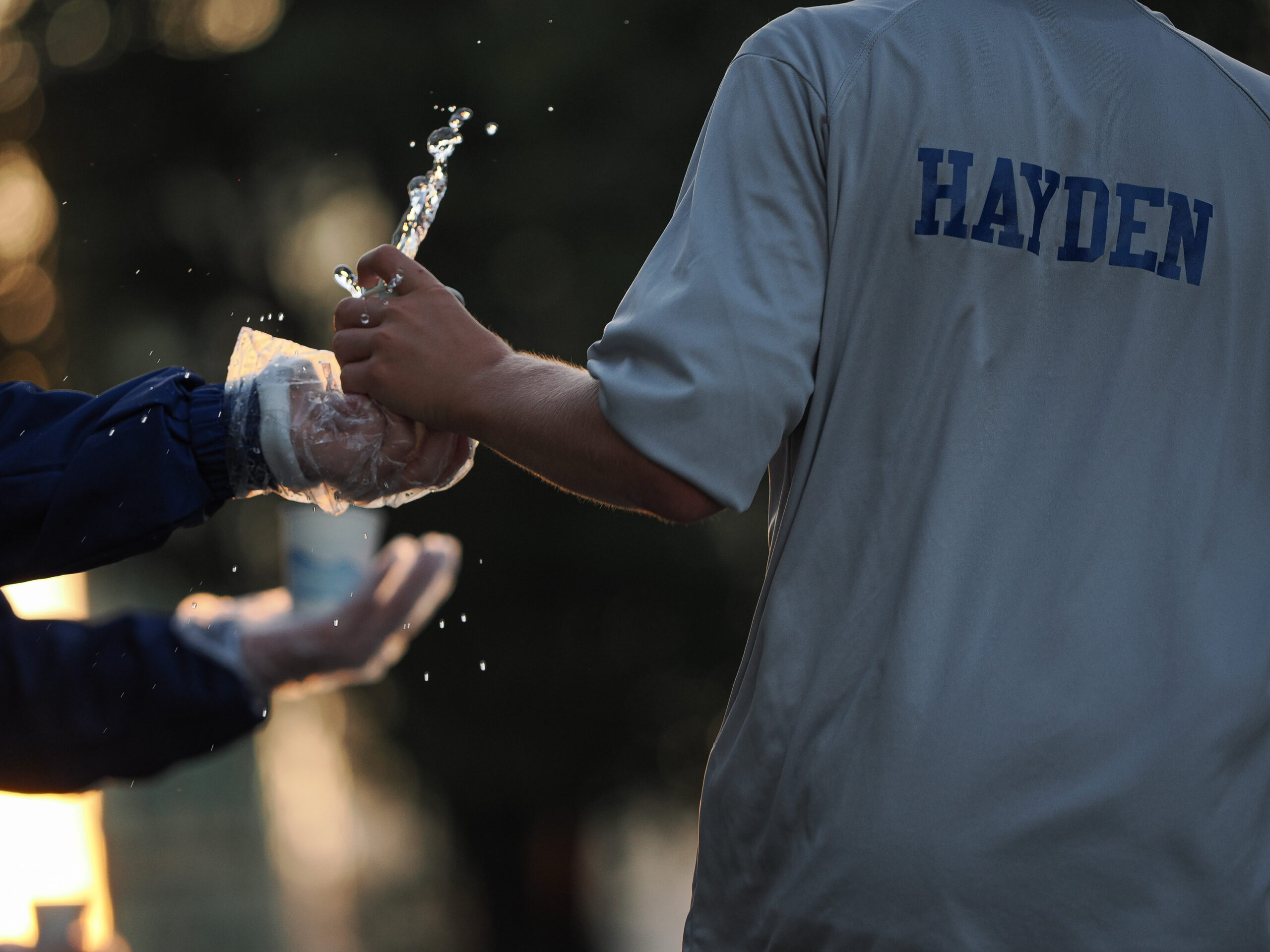 A runner grabs water from a hydration station on Third Street during the Mill Race Marathon in downtown Columbus, Ind., Sept. 27, 2025.