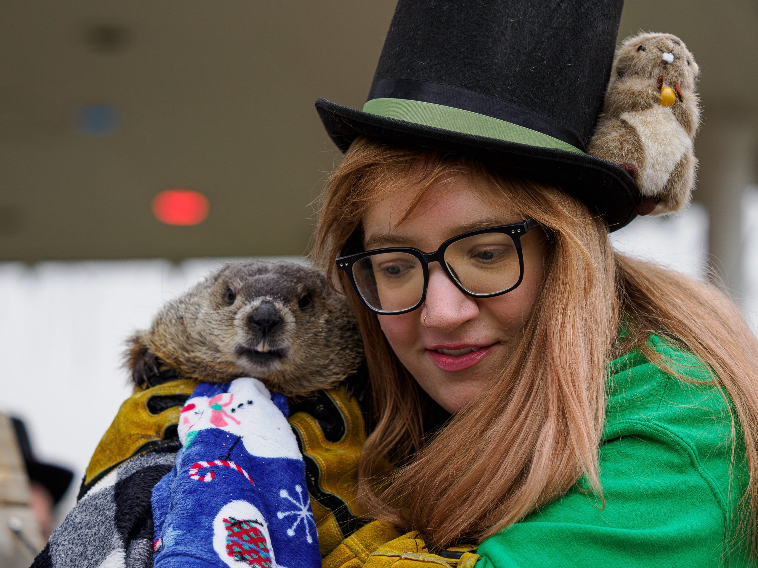 Katie Kolcun, with Utopia Wildlife Rehabilitators, listens to Hope the groundhog give her weather prediction during the annual Groundhog Day ceremony on the Hope Town Square in Hope, Ind., Sunday, Feb. 2, 2025. Hope the groundhog predicted six more weeks of winter.