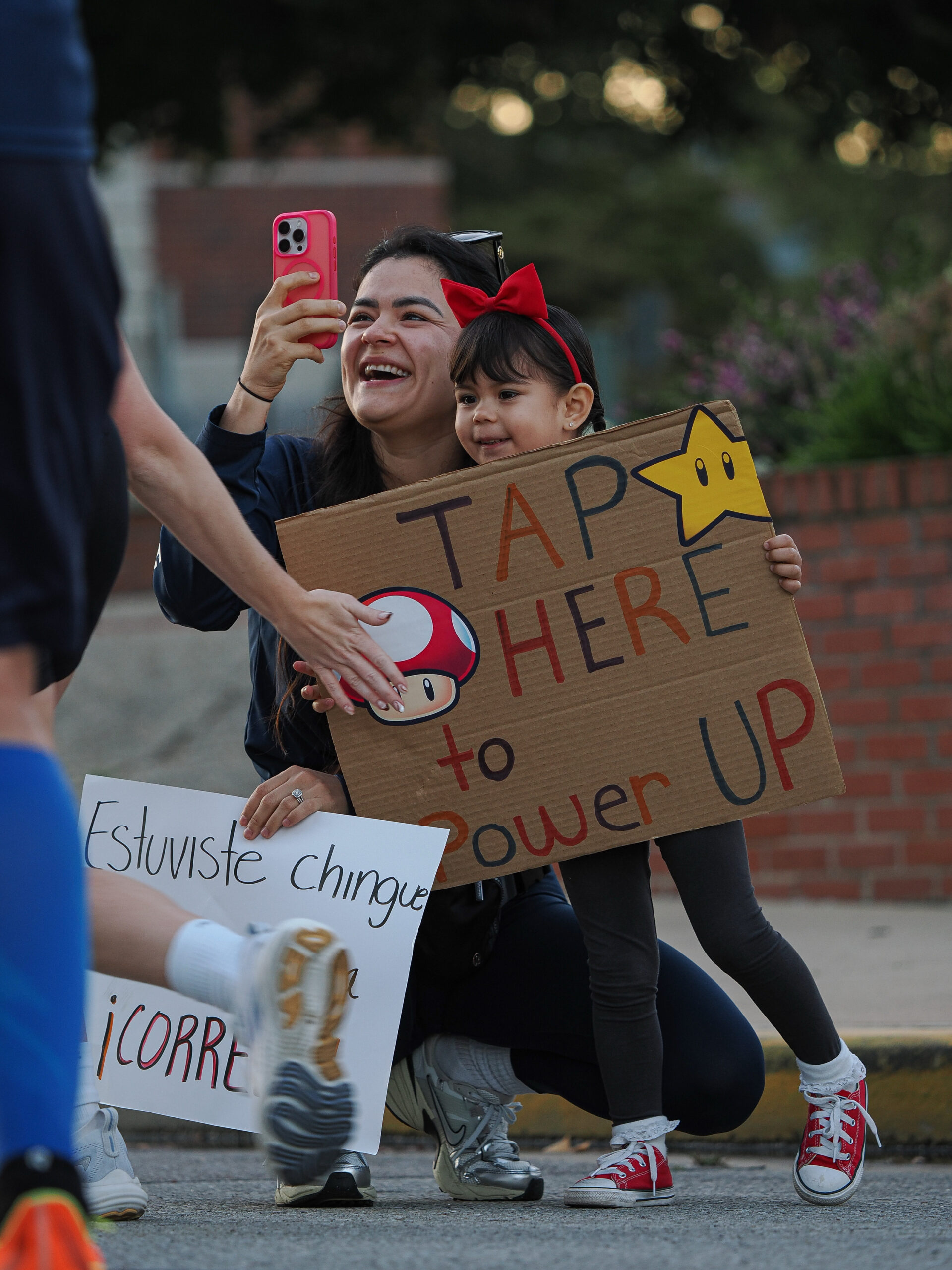 Catalina Contreras and her daughter Ximena motivate runners on Third Street during the Mill Race Marathon in downtown Columbus, Ind., Sept. 27, 2025.
