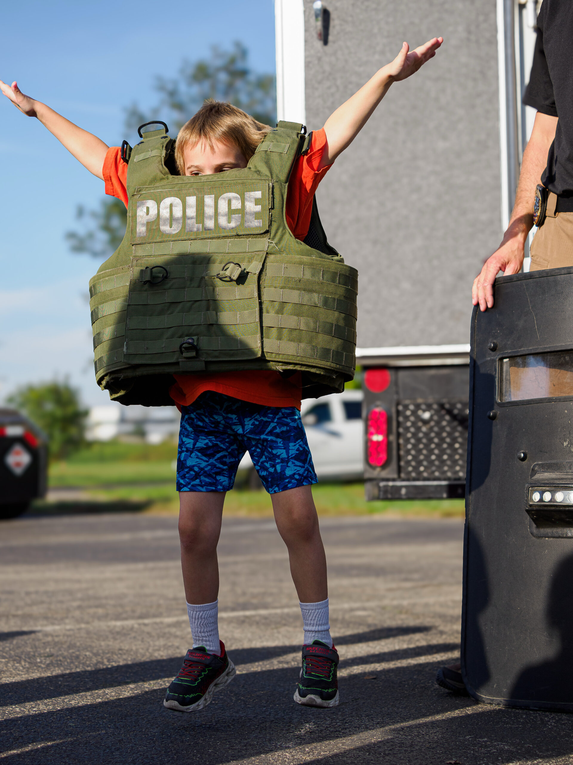 CSA Fodrea kindergartner Liam Pruitt performs a jumping jack while wearing police body armor during Famliy School Partners 29th annual Touch-a-Truck event at Clifty Park in Columbus, Ind., Thursday, Oct. 2, 2025.