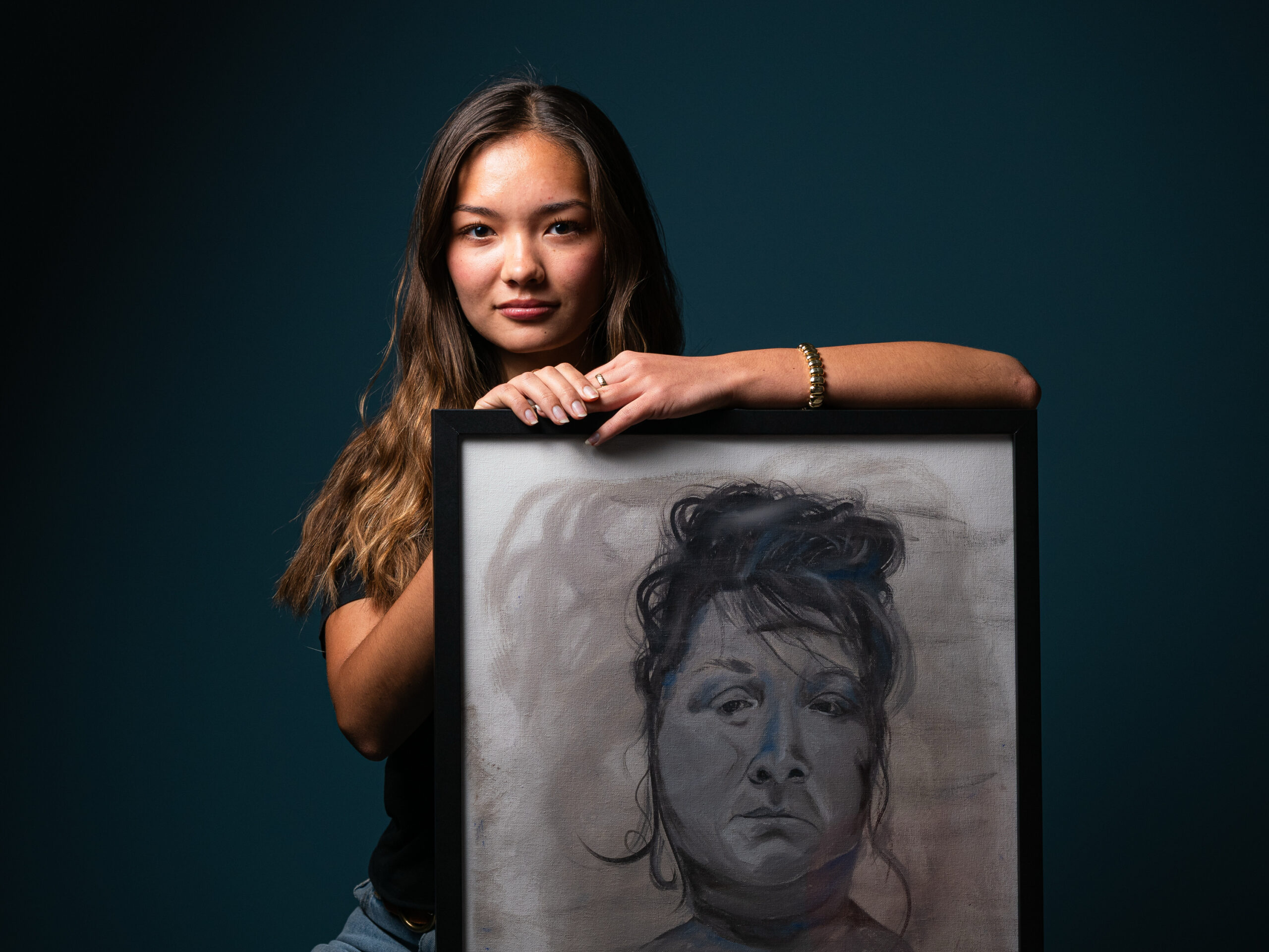 Columbus East senior Saya Hauser poses with a painting that will be for sale at an exhibit for her senior project, the Kintsugi Project, that will raise money for a legal fund to provide grants for low income families facing custody related legal fees. She is pictured at The Republic, Monday, Oct. 6, 2025 in Columbus, Indiana. Hauser, a survivor of domestic violence herself, came up with the project after she watched her mother spend tens of thousands of dollars in legal fees as she was fighting for sole custody of Hauser. The exhibit is from 6-8 p.m. Thursday, October 6th at The Office of Downtown Development in Columbus.