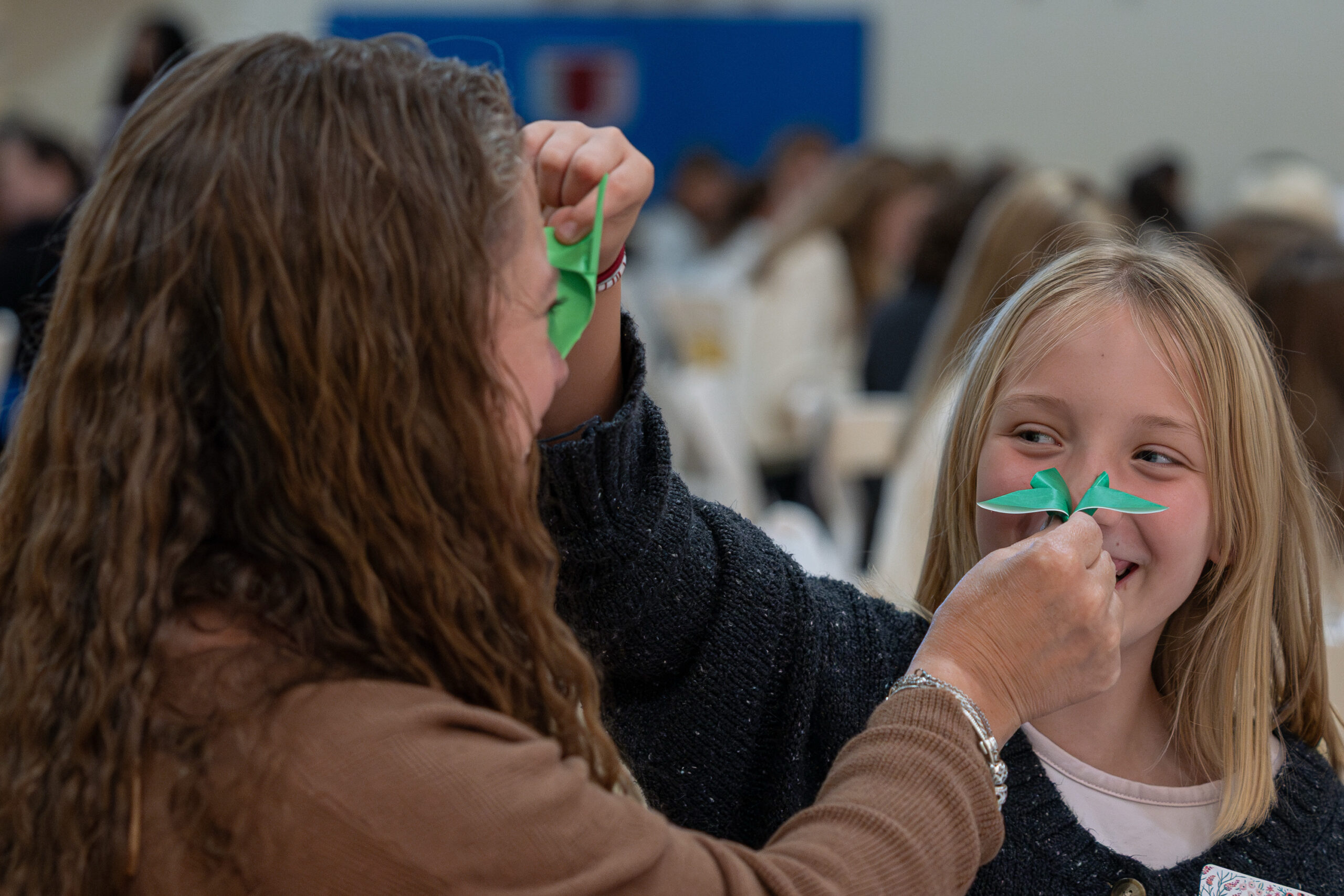 Stacey Meier, left, and Kaylee Mattingly tickle each other’s noses with their origami butterflies during the annual Great Girls, Wonderful Women luncheon at Foundation for Youth in Columbus, Ind., Oct. 9, 2025.