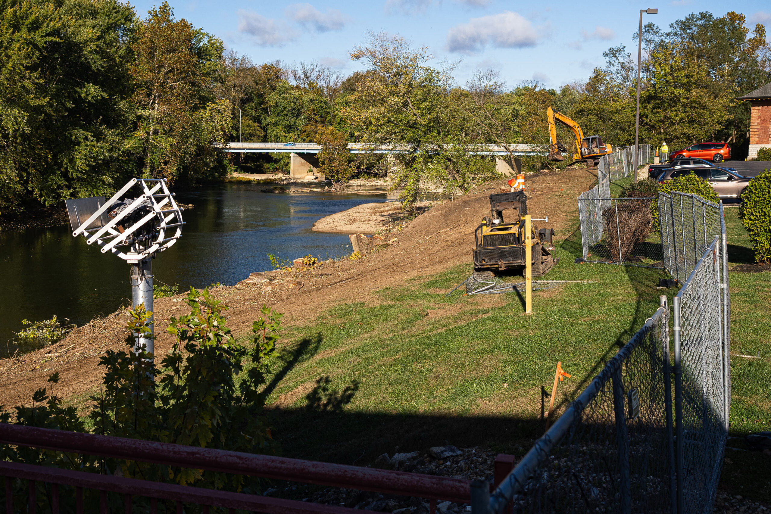 Trees are being removed from the riverbank near Upland Columbus Pump House to make way for the riverfront project, Wednesday, Oct. 22, 2025 in Columbus, Indiana.
