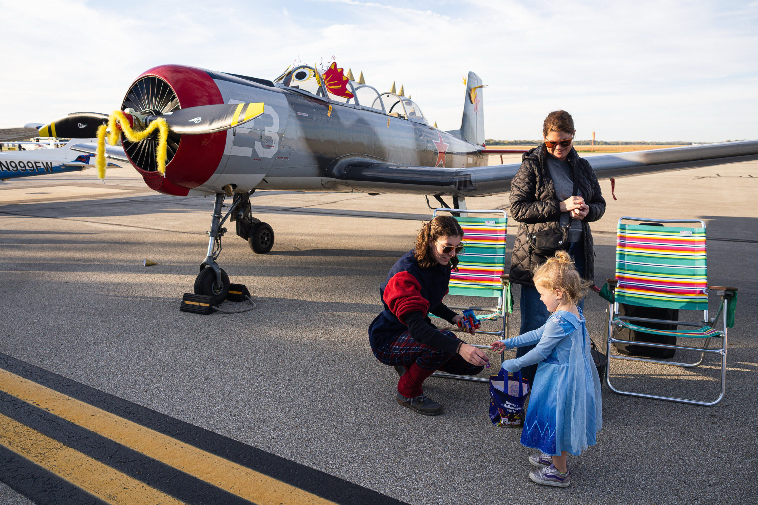 Oaklynn Larrison stops by Kate and Kirsten Russell’s station for some candy during the Pumpkins and Props Halloween event at the Columbus Municipal Airport in Columbus, Ind., Friday, Oct. 24, 2025.