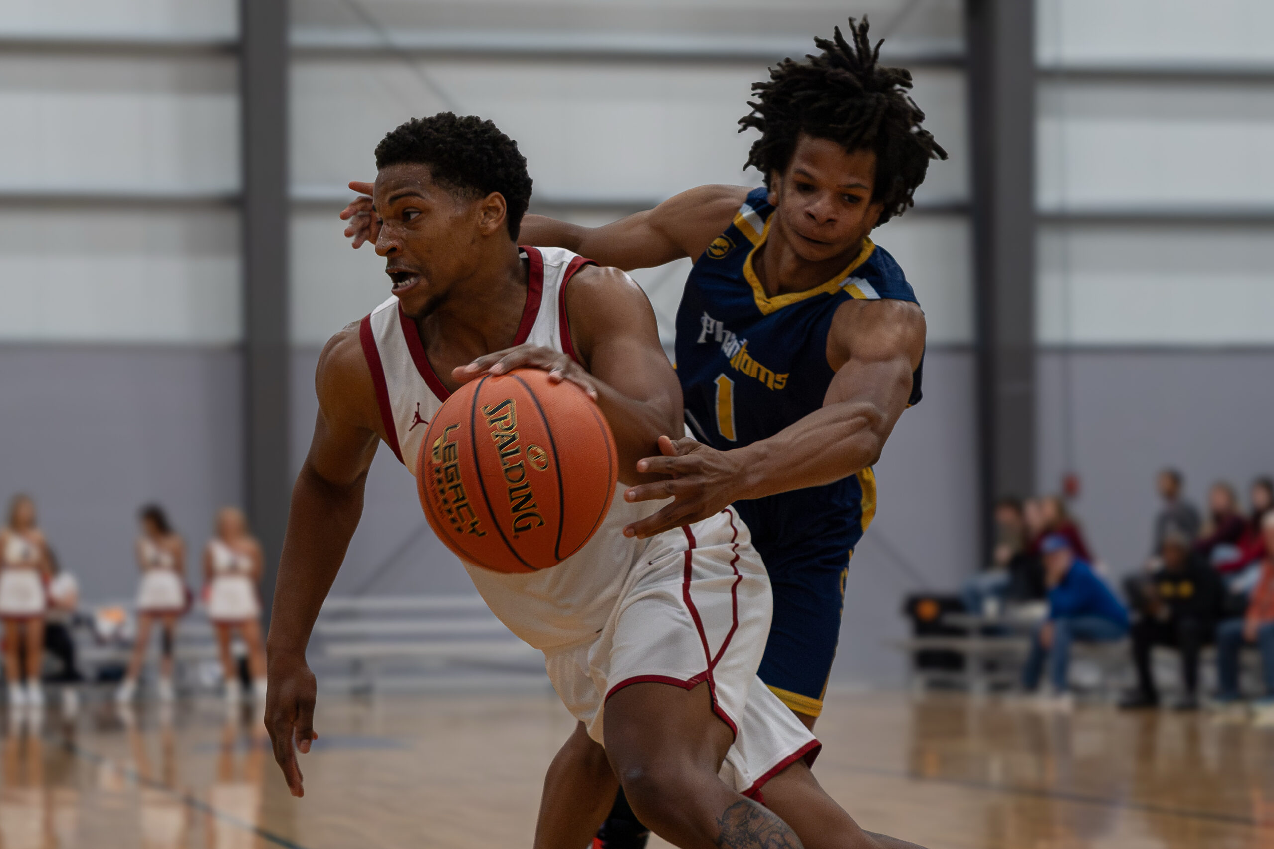 IU Columbus’ Damontae Thompson, left, dribbles past East/West University’s David Hood during a college basketball game in the Circle K Fieldhouse in Columbus, Ind., Tuesday, Oct. 28, 2025.