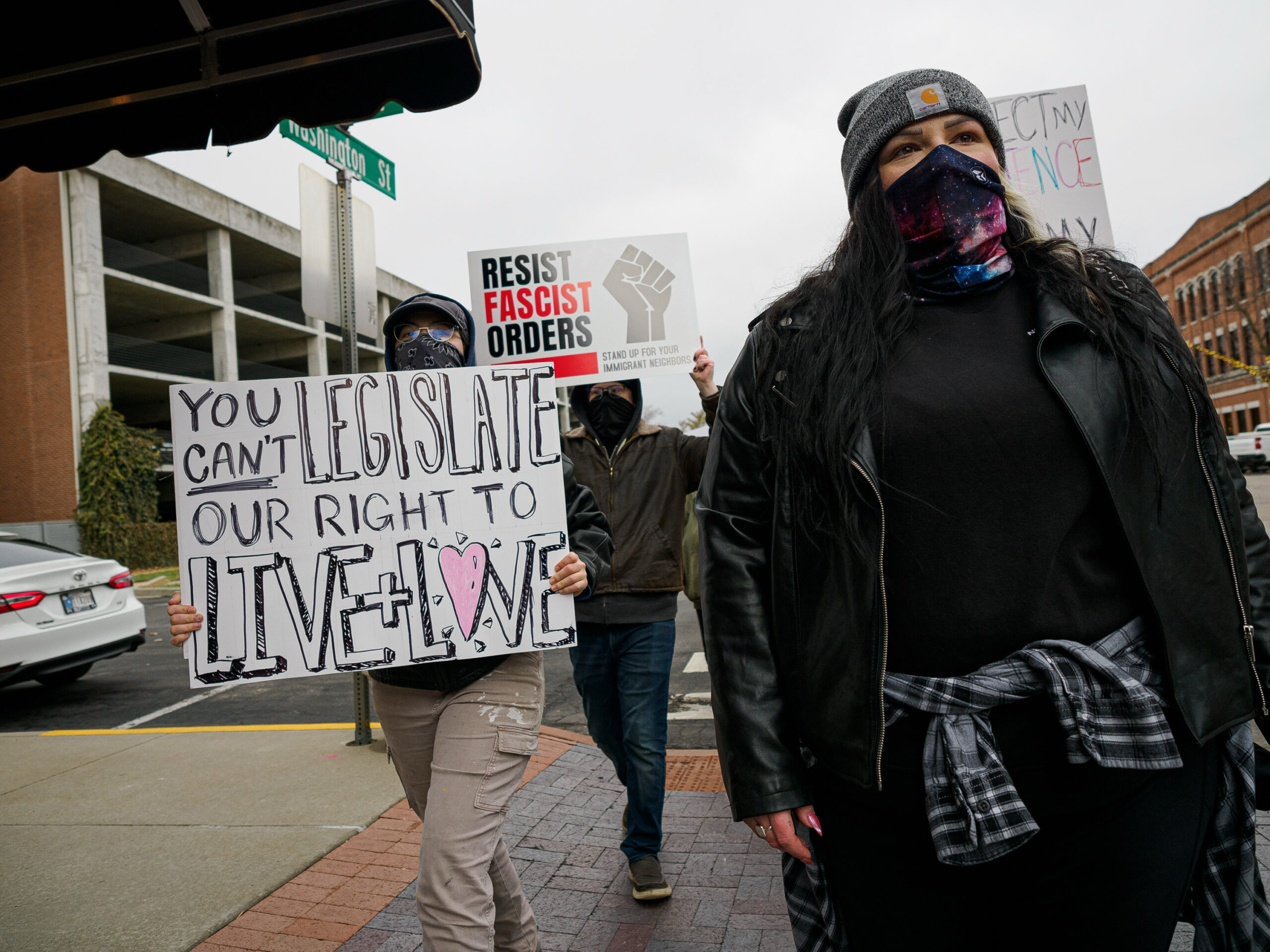 Protesters march through downtown Columbus, Ind., Thursday, Feb. 6, 2025. Protesters marched to show opposition to President Donald Trump and Indiana Gov. Mike Braun’s policies.
