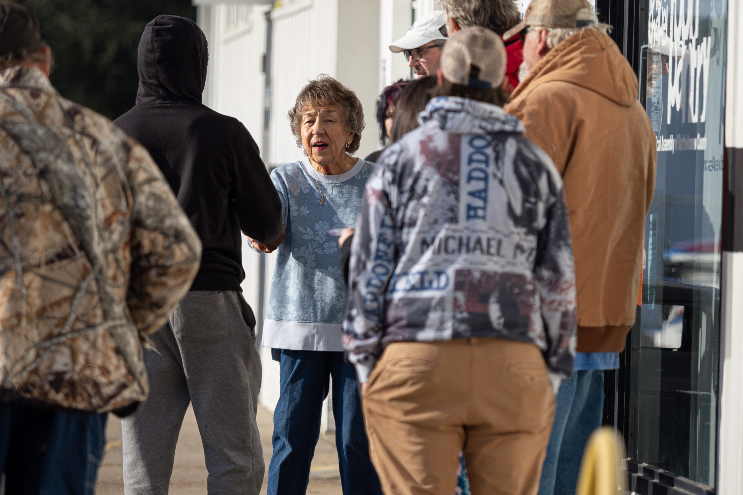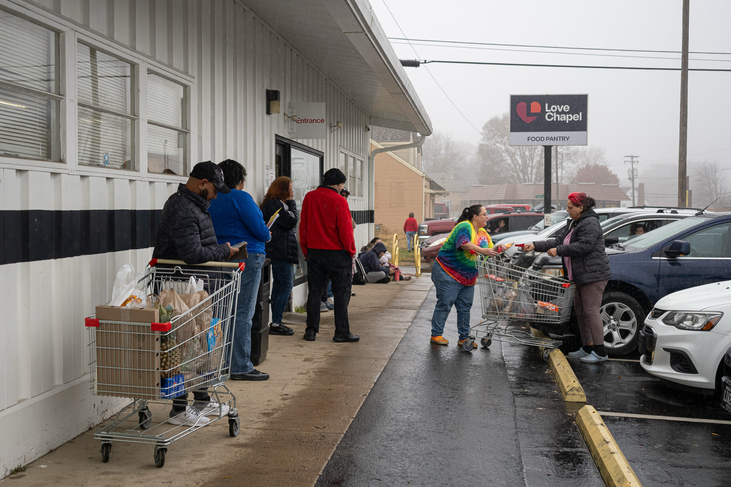 Volunteer Rosa Deal helps clients outside the Love Chapel Food Pantry in Columbus, Ind., Tuesday, Nov. 4, 2025.