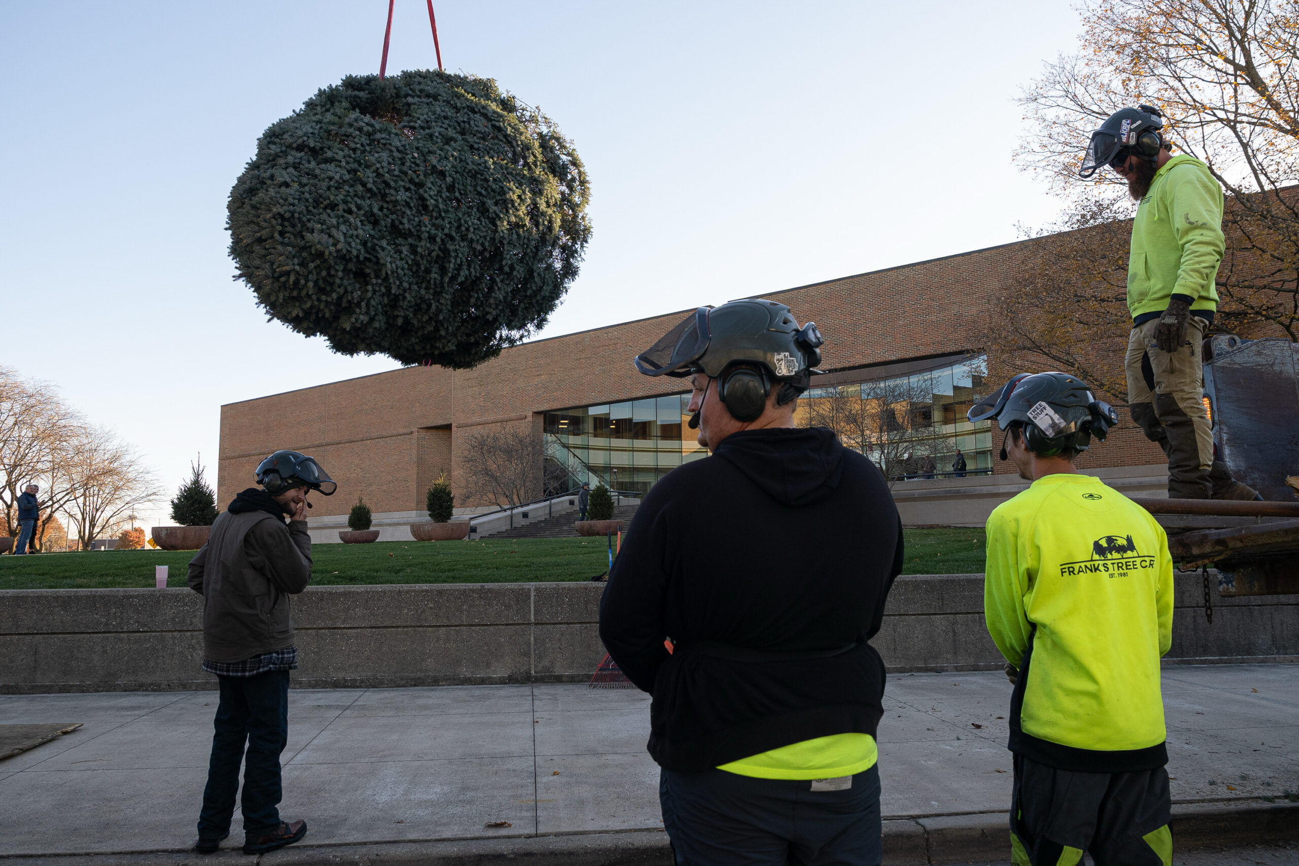 The City of Columbus’ Christmas Tree is lowered into position at Columbus City Hall in Columbus, Ind., Monday, Nov. 17, 2025. The aging Blue Spruce was donated to the city by Beverly Perry.