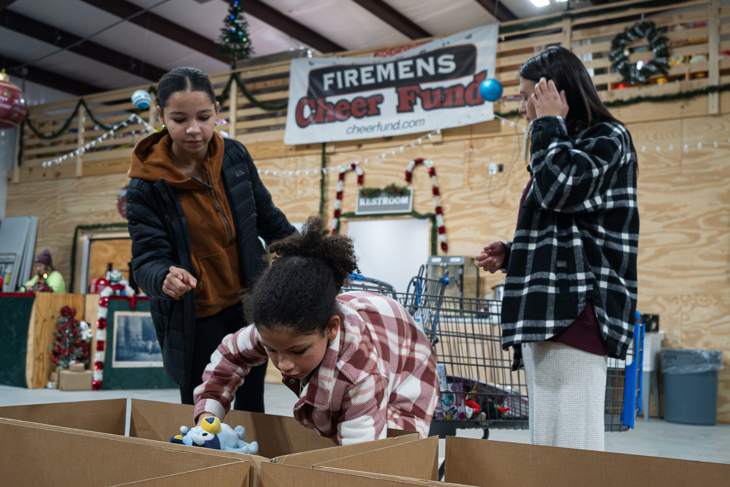 Volunteers Ari Carr, from left, Kaydence Carr and Bailey Dill pack a gift box during a public boxing event for the Columbus Firemen’s Cheer Fund at the Columbus Firemen’s Cheer Fund building in Columbus, Ind., Tuesday, Dec. 2, 2025.