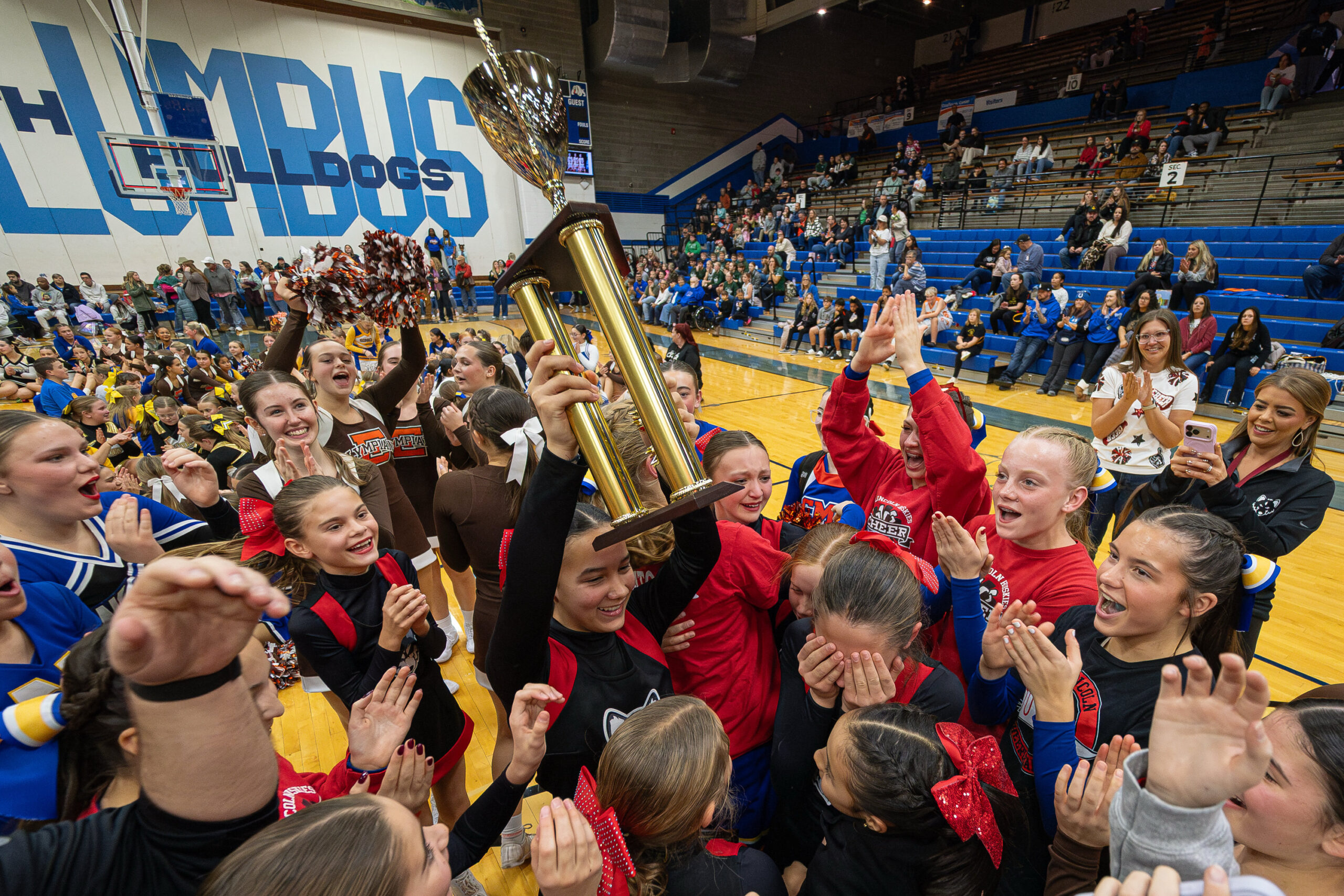 CSA Lincoln cheerleaders celebrate with their trophy after winning first place in the annaul Elementary Athletic League Cheer Day competition at Columbus North High School in Columbus, Ind., Saturday, Dec. 6, 2025. CSA Lincoln took first place, Rockcreek took second place and Clifty Creek took third in the competition.