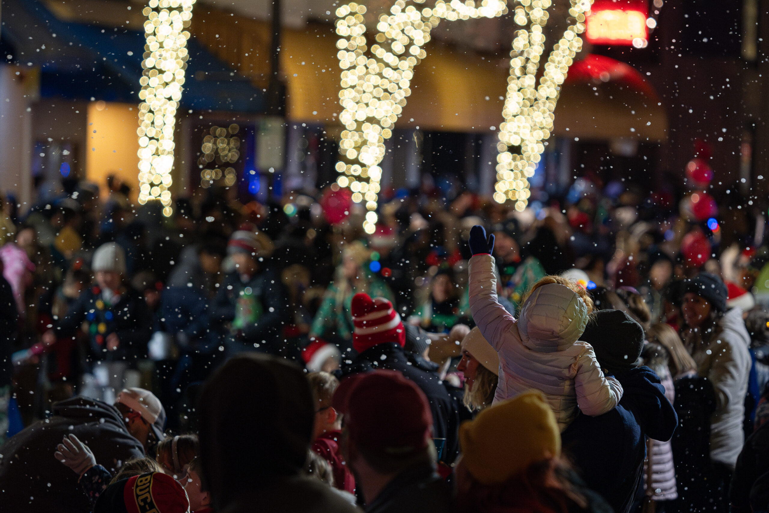 Fake snow falls on spectators during the annual Festival of Lights Parade in Columbus, Ind., Saturday, Dec. 6, 2025.