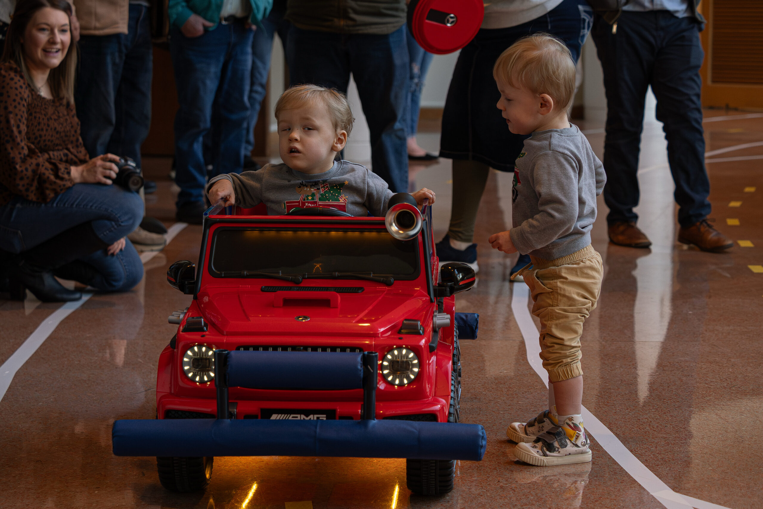 Nicky Bokelman passes by his twin brother Malachi as he takes a spin in his Go Baby Go project vehicle at Columbus City Hall in Columbus, Ind., Monday, Dec. 8, 2025.