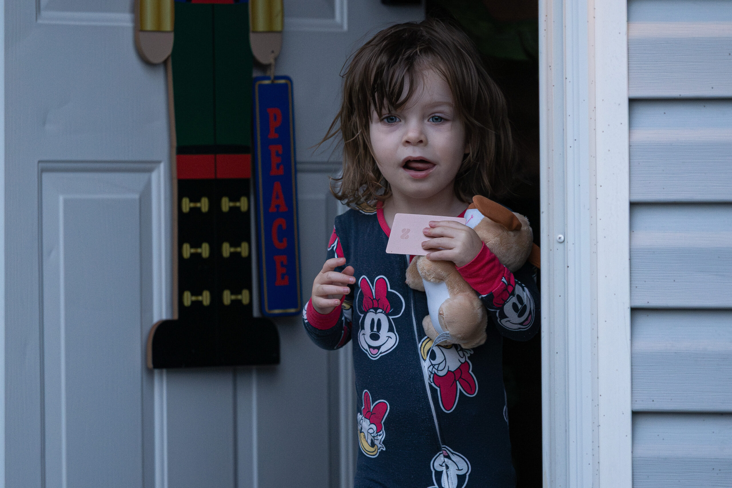 Adeline Allen reacts to seeing a fire truck carrying Santa and Mrs. Claus arrive at her house to deliver her giftbox from the Columbus Firemen’s Cheer Fund in Columbus, Ind., Saturday, Dec. 13, 2025.