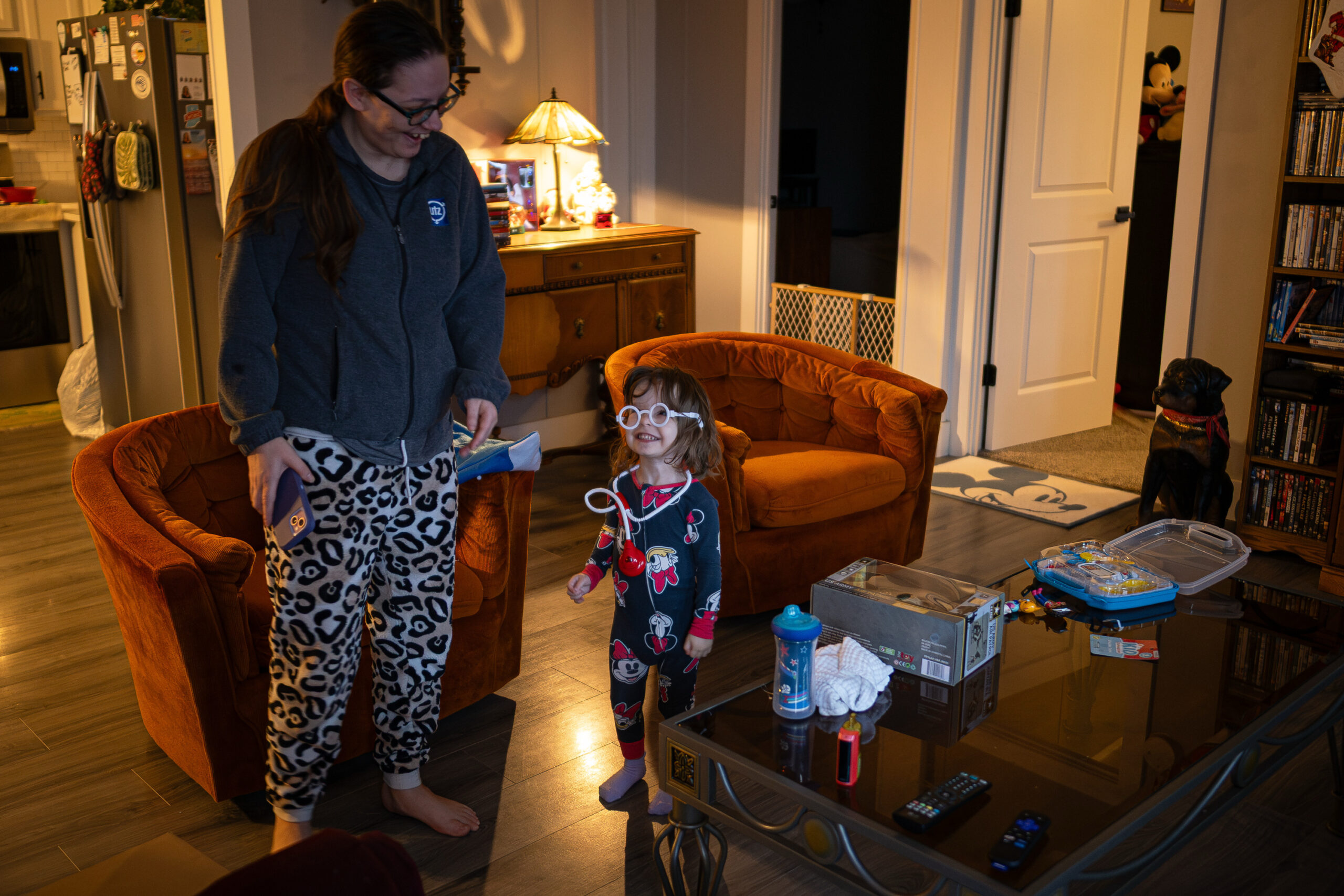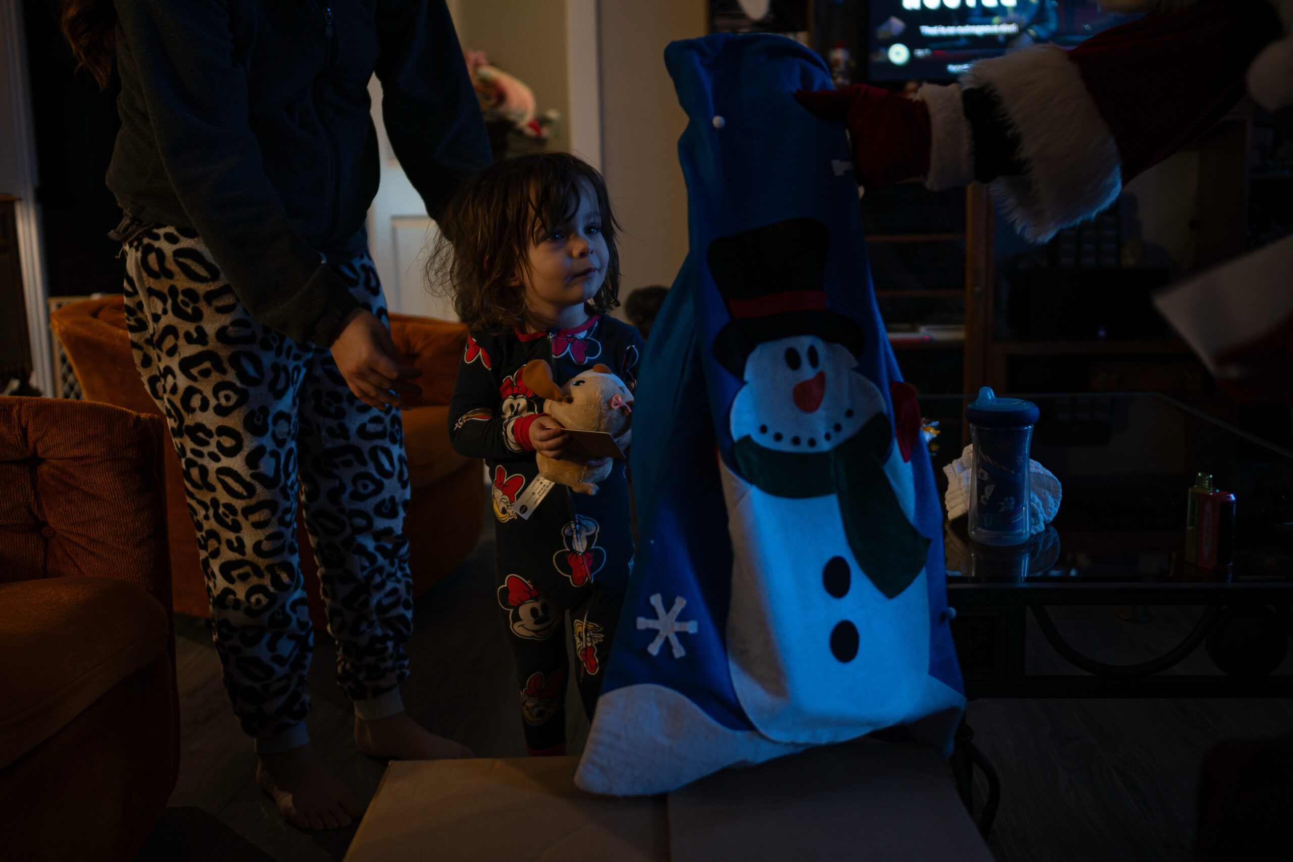 Desiree Allen smiles as she watches her daughter Adeline play with some of the toys she received from the Columbus Firemen’s Cheer Fund in Columbus, Ind., Saturday, Dec. 13, 2025.