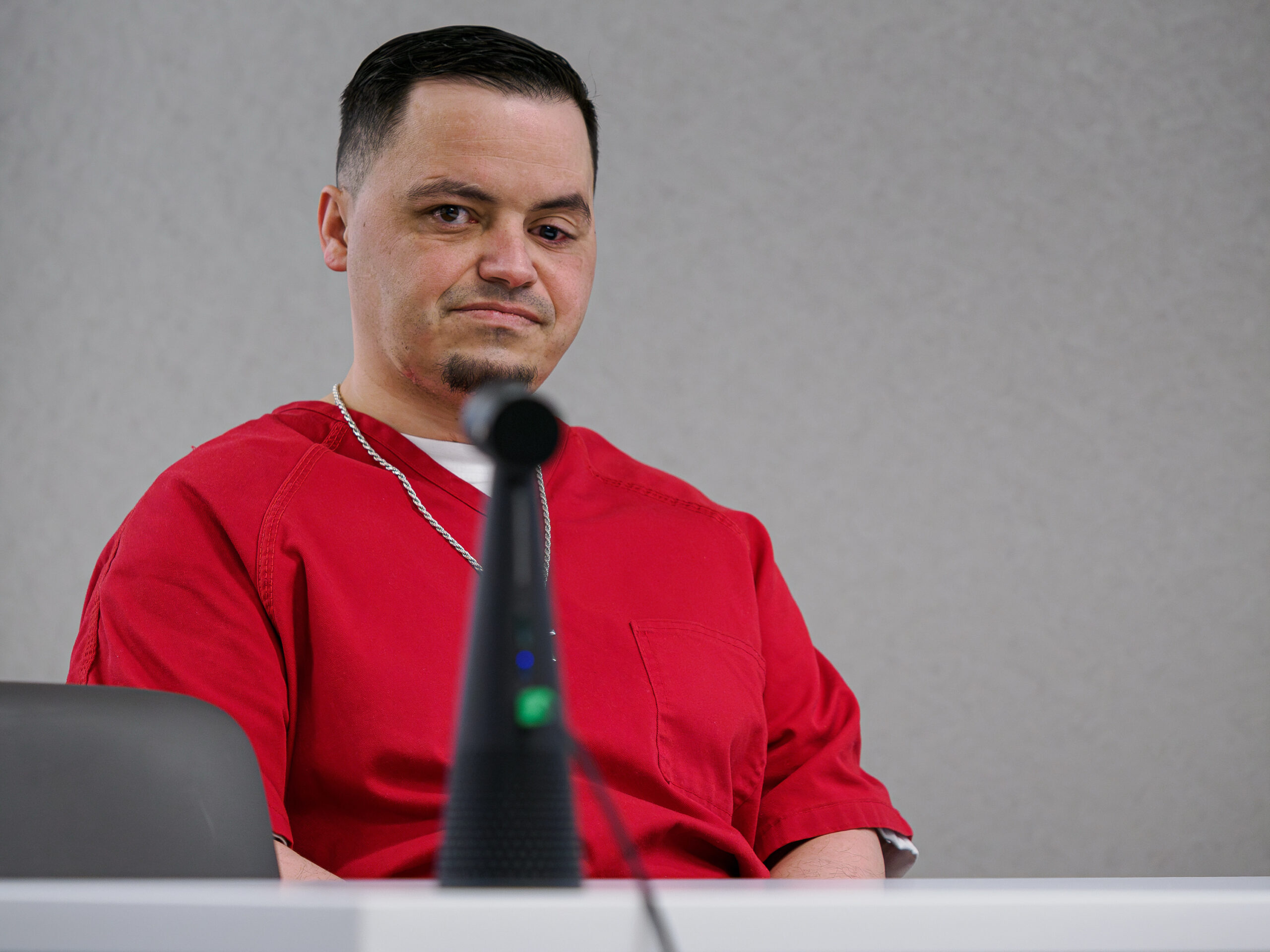Robbie Perez waits to be sentenced for shooting his brother George Perez Jr. and three-year-old nephew Kingston in the temporary circuit courtroom in the Bartholomew County Court Services Center in Columbus, Ind., Friday, Feb. 7, 2025. Perez was sentenced to 16 years for the shooting of his brother and 16 years for the shooting of his nephew both to be served consecutively for a total of 32 years. Both victims survived the shootings.