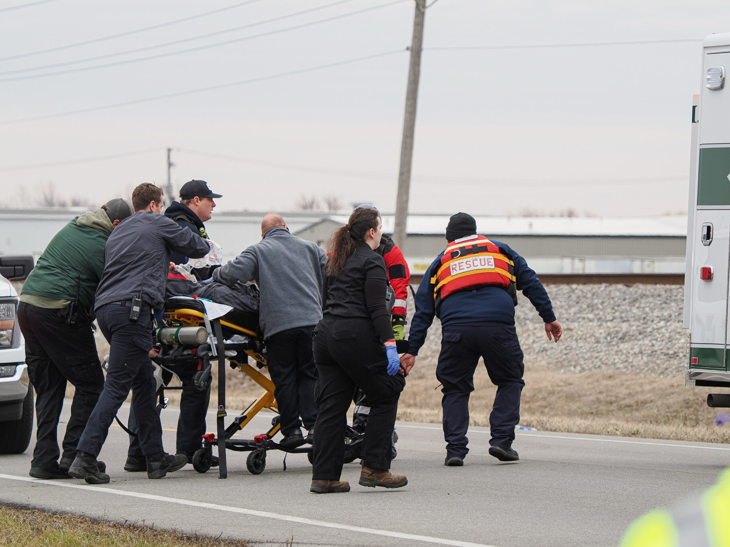 First responders work to resuscitate the motorist of a vehicle that crashed into a retention pond at the intersection of Kenholt Drive and Indianapolis Road near Applied Laboratories, Inc., in Columbus, Ind., Tuesday, Feb. 11, 2025.