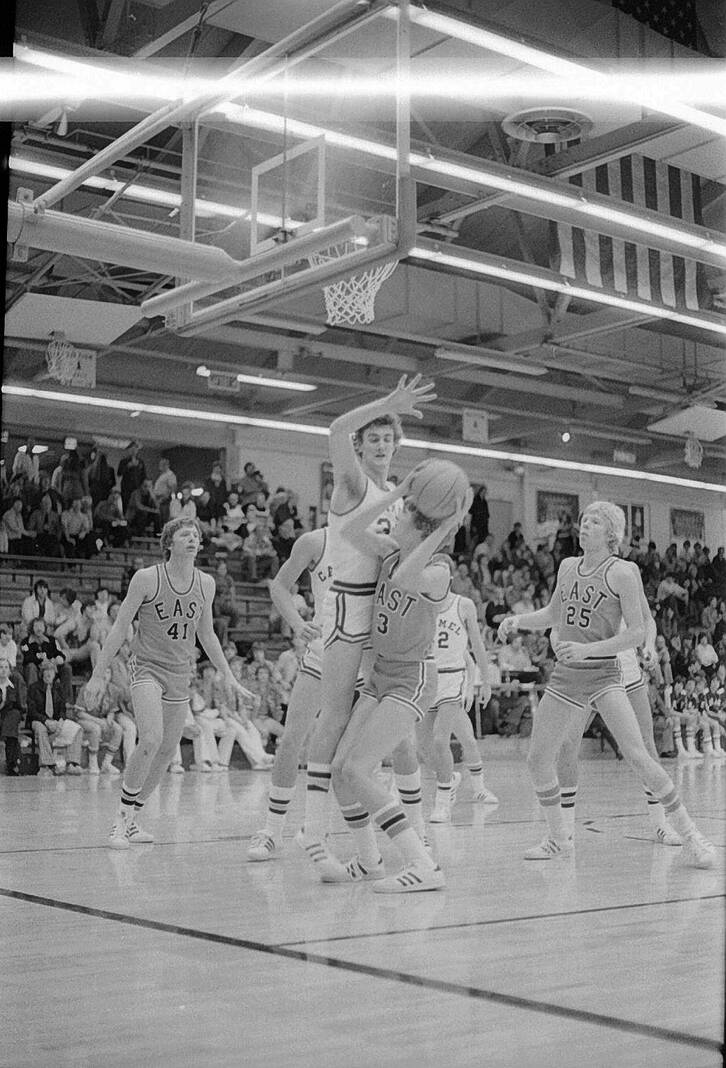 Columbus East’s Gary Huffman (3) has his path blocked by Carmel’s Jon Ogle as he eyes the basket during the Carmel Holiday Tournament on Dec. 27, 1975. Ed Muir (41) and Mark Kiel (25) look on.