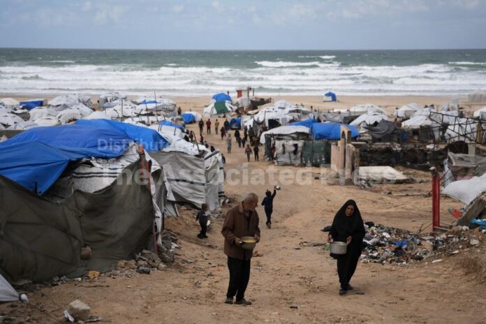 KHAN YOUNIS, Gaza Strip (AP) — Rain lashed the Gaza Strip over the weekend, flooding makeshift encampments with ankle-deep puddles as Palestinians displaced by the two-year war attempted to stay dry in tents frayed by months of use.