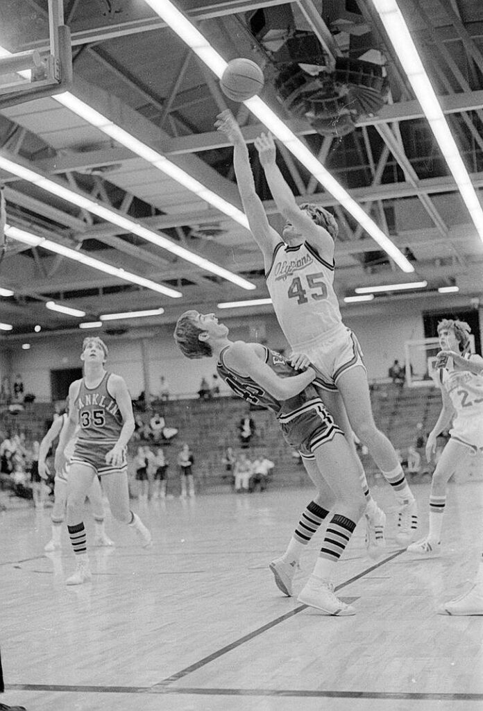 Franklin’s Tim Thomas gets a good look at Columbus East’s Ed Muir (45) as the Olympian center goes high in the air for his shot on Dec. 27, 1975.