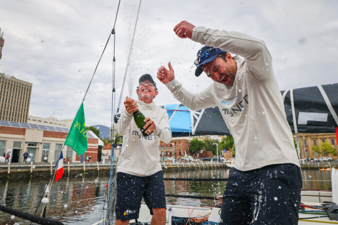 Michel Quintin and Yann Rigal arrived at Constitution Dock in Hobart on their 35-foot yacht BNC on Tuesday morning after spending more than 93 hours at sea. They were the 33rd crew across the line but the first doubled-handed yacht, a craft sailed by just two people, to make it to Hobart from the start last Friday morning in Sydney harbor.