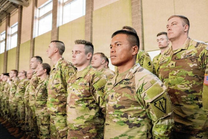 Indiana National Guard soldiers with 113th Engineer Battalion, based in Gary, and assigned to Joint Task Force – District of Columbia, during a departure ceremony in Franklin, Indiana, Dec. 5, 2025. Hoosier Guardsmen on this mission will assist the local and federal law enforcement partners with community safety patrols, traffic control posts and crowd flow support.