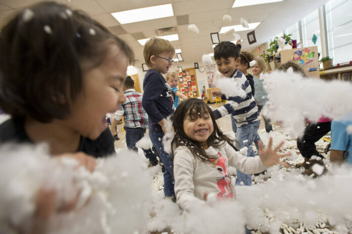 Ashdyn Lucas, in glasses, Cindy Rodriguez, center, and Milton Sangabriel-Cortez, right, toss fake snow on each other in their pre-kindergarten class at the Busy Bees Academy in Columbus on Dec. 18, 2015.