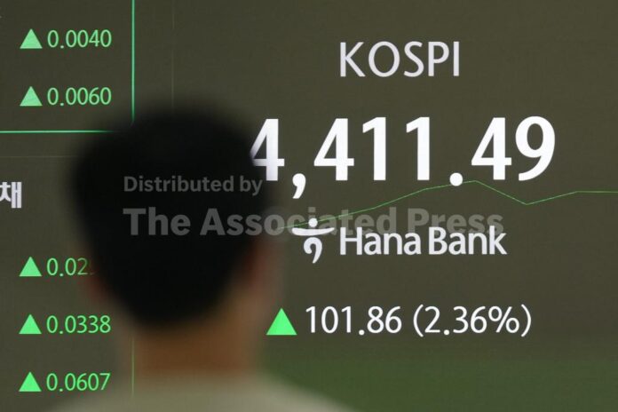 South Korea’s Kospi surged 2.3% to 4,406.55. It had ended Friday with a record high close.