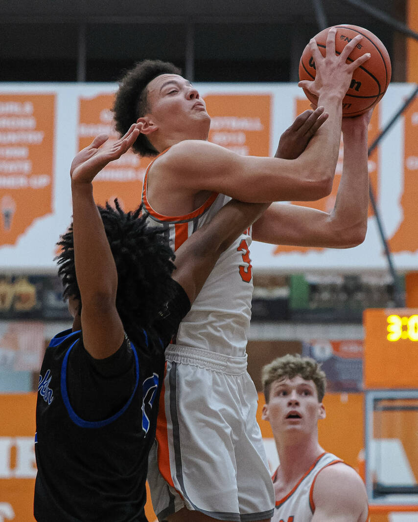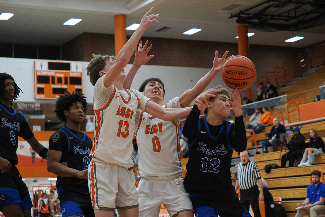 Columbus East’s Logan Neal, from left, East’s Anthony Cowan and Franklin’s Omari Thomas reach for a rebound during a basketball game at Columbus East High School in Columbus, Ind., Tuesday, Jan. 6, 2026.
