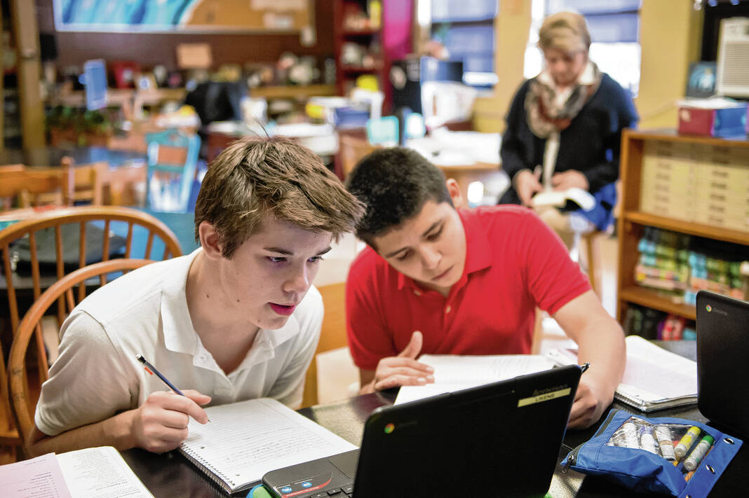 Seventh grade students Carson Likens, left, and Jose Trinidad, right, use a Chromebook for school work during class at St. Bartholomew Catholic School in Columbus on Jan. 6, 2016.