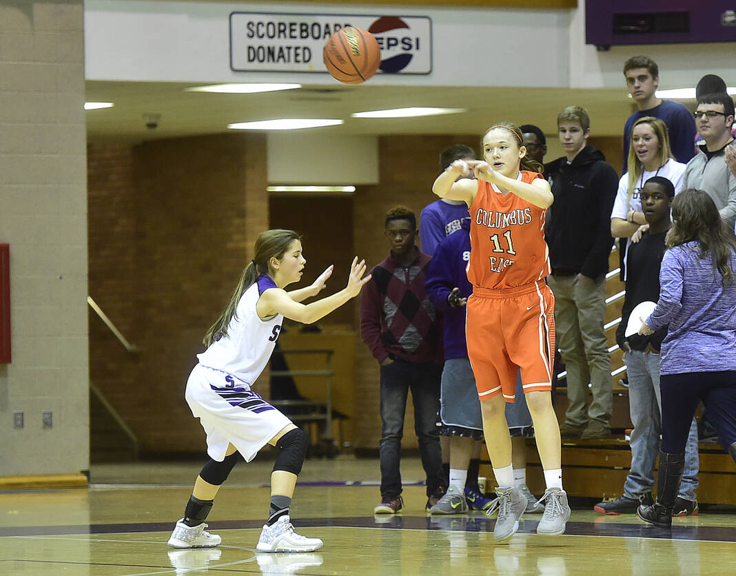 Columbus East sophomore Britney Ballard passes the ball on Jan. 7, 2016, during East’s game against Seymour.