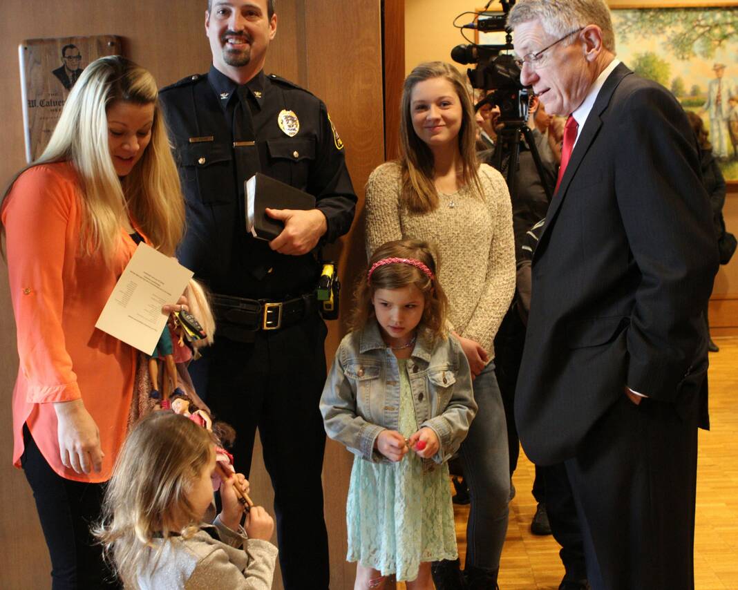 Emerson Rohde shows Mayor-elect Jim Lienhoop her Barbie doll before the Jan. 1, 2016, city of Columbus public officials’ swearing-in ceremony. Pictured, clockwise from bottom left, are Emerson Rohde, Sarah Rohde, Police Chief Jon Rohde, Falesha Rohde, Bailey Rohde and Jim Lienhoop.