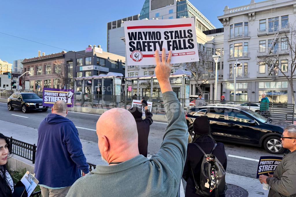 A steady stream of Waymo cars drove past the protest, a testament to the growing ubiquity of the white cars in San Francisco.