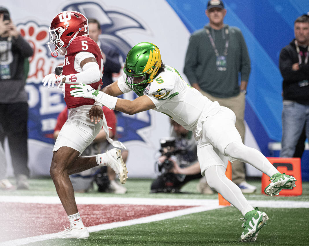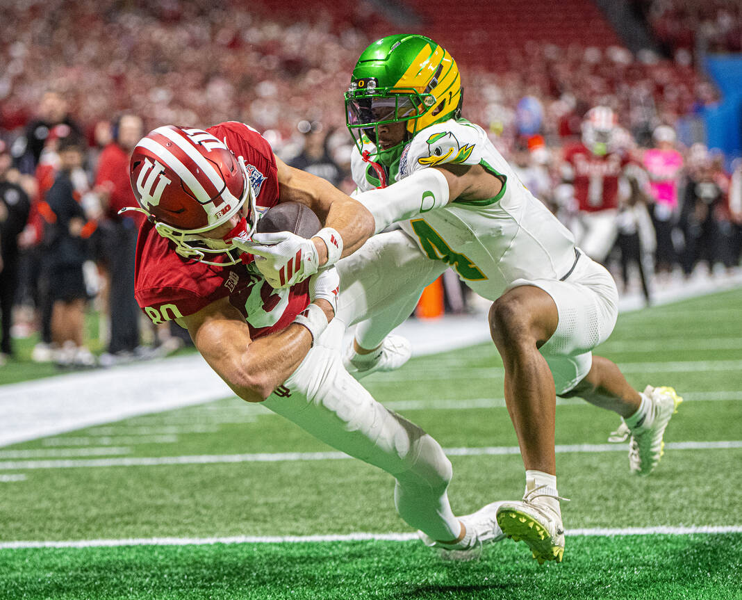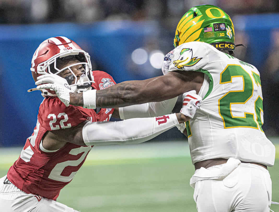 Indiana’s Ace Ciongoli pushes Oregon’s Jadon Candy out of bounds during Friday’s CFP semifinal Chick-Fil-A Peach Bowl in Atlanta.