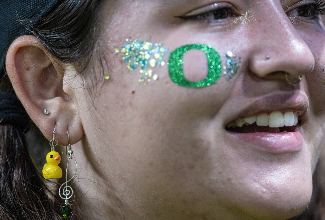 An Oregon band member sports a duck earring as she gets ready to perform before Friday’s CFP semifinal Chick-Fil-A Peach Bowl in Atlanta.