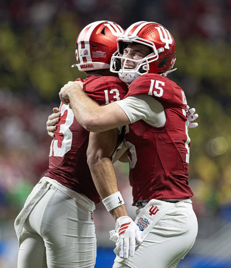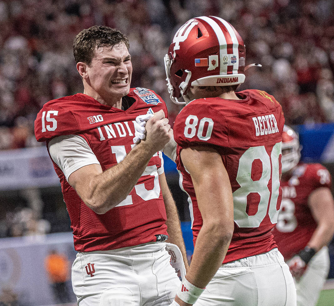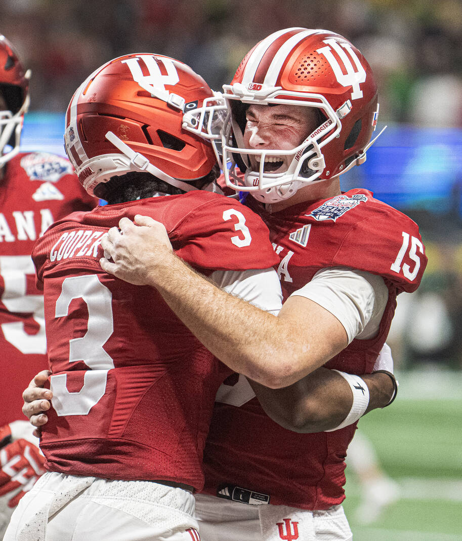 Indiana’s Fernando Mendoza reacts after a touchdown with Elijah Sarratt against Oregon during Friday’s CFP semifinal Chick-Fil-A Peach Bowl in Atlanta.