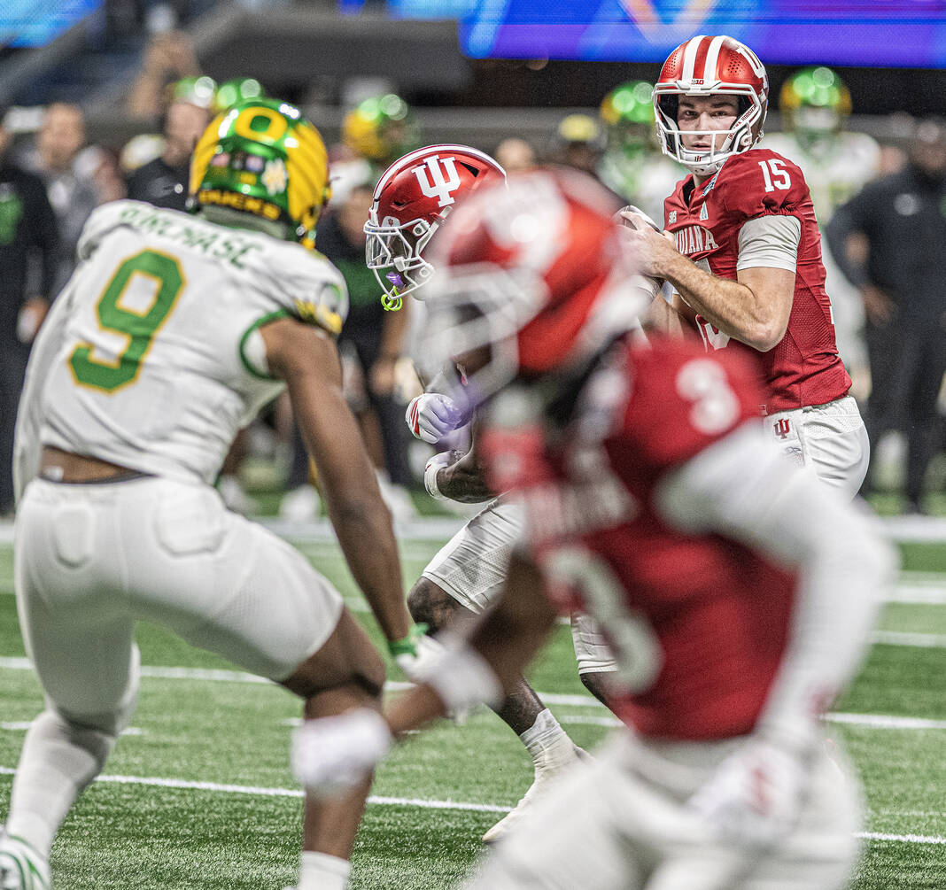 Indiana’s Fernando Mendoza drops back to pass against Oregon during Friday’s CFP semifinal Chick-Fil-A Peach Bowl in Atlanta.