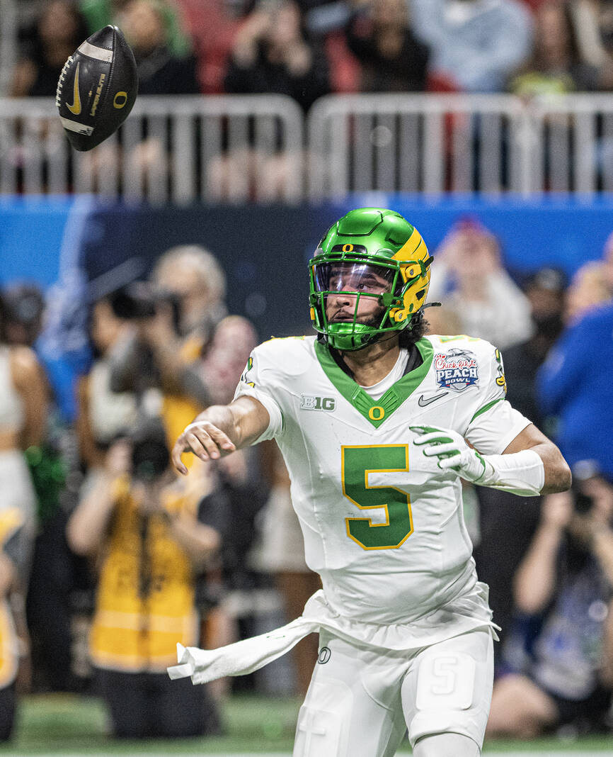 Oregon quarterback Dante Moore loses the ball, which eventually was recovered by Indiana, during Friday’s CFP semifinal Chick-Fil-A Peach Bowl in Atlanta.