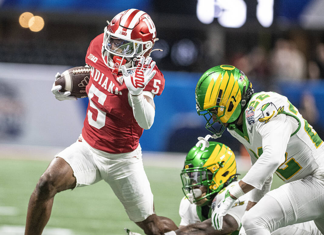 Indiana’s D’Angelo Ponds runs past two Oregon defenders during Friday’s CFP semifinal Chick-Fil-A Peach Bowl in Atlanta.