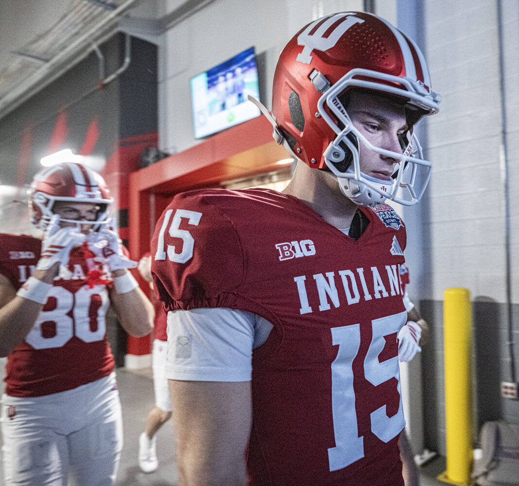 Indiana’s Fernando Mendoza and Charlie Becker walk out of the locker room moments before the start of Friday’s CFP semifinal Chick-Fil-A Peach Bowl in Atlanta.
