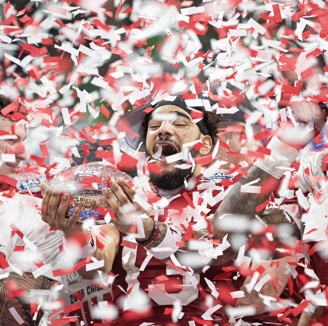 Indiana players are covered in confetti as they celebrate winning Friday’s CFP semifinal Chick-Fil-A Peach Bowl in Atlanta.