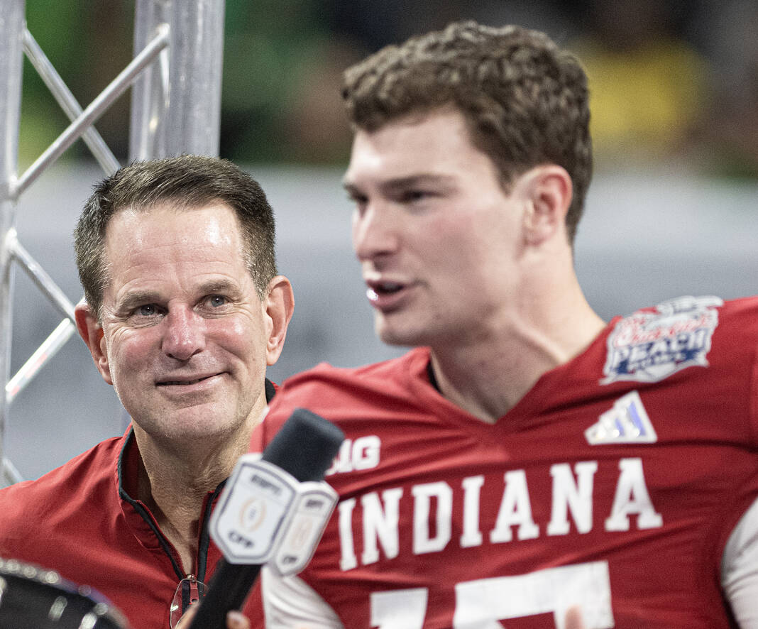 Indiana coach Curt Cignetti listens to quarterback Fernando Mendoza on the victory stand after Friday’s CFP semifinal Chick-Fil-A Peach Bowl in Atlanta.